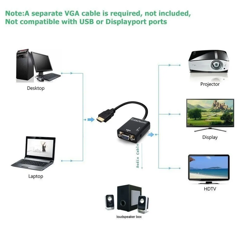 HDMI / Micro HDMI / Mini HDMI a VGA per collegare un facilita dispositivi compatibili HDMI (computer portatili, desktop, Apple TV, ecc) / micro HDMI / Mini HDMI ad un proiettore / monitor con porta VGA. È necessario un cavo VGA. (venduto separatamente) Ideale per l’insegnamento, presentazione aziendale, home theater, ecc
