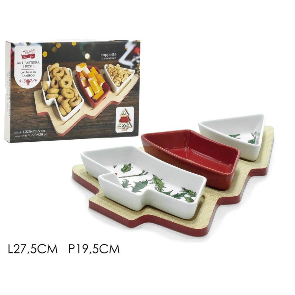 ANTIPASTIERA A 3 SCOMPARTI IN BIANCO ROSSO AGRIFOGLIO ALBERO DI NATALE DECORAZIONE TAVOLA