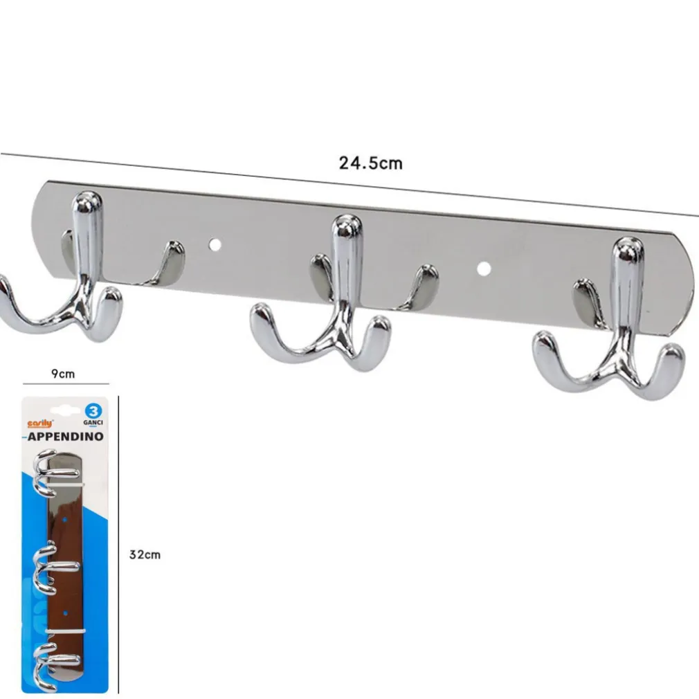Favoloso attaccapanni con fissaggio a parete con 3 ganci doppi cromati. Una soluzione salvaspazio comoda e utile per la tua camera.