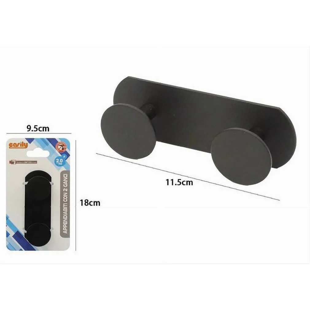 Le caratteristiche principali includono il colore nero, due ganci, dimensioni di 11.5 cm, portata massima di 2kg e fissaggio adesivo.