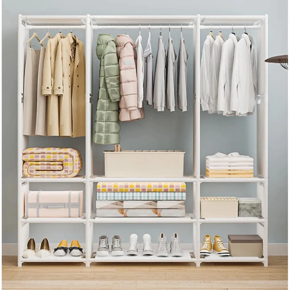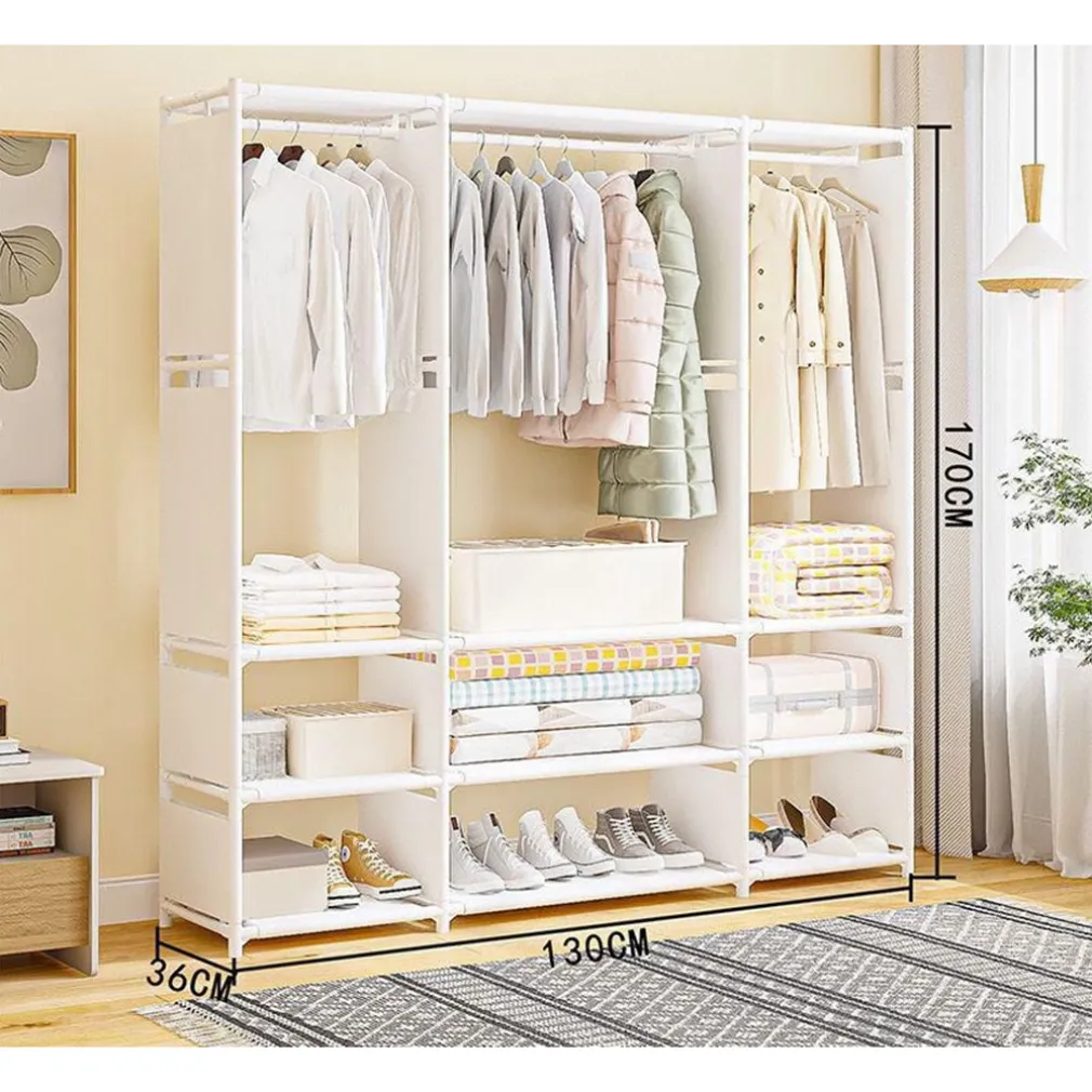 L’ARMADIO CON RIPIANI BARRA APPENDIABITI IN METALLO MULTIFUNZIONALE PER CAMERA INGRESSO CASA è la soluzione ideale per chi vuole ottimizzare lo spazio senza rinunciare all’eleganza. La sua struttura in tubi d’acciaio antiruggine offre stabilità e affidabilità, mentre i ripiani in tessuto impermeabile risultano facili da pulire e perfetti per organizzare vestiti, scarpe e accessori.