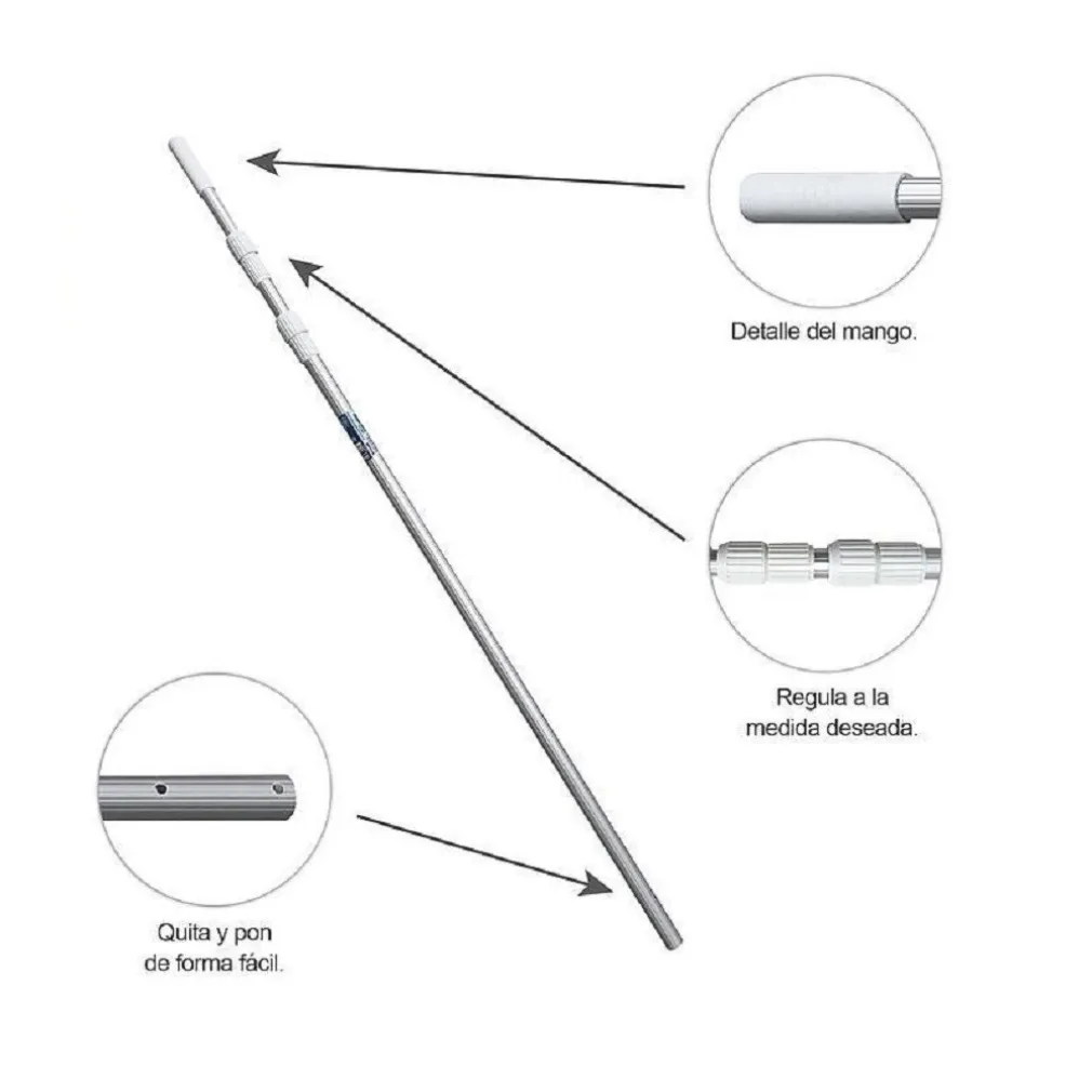 L’asta telescopica in alluminio ti permette di arrivare facilmente, con il tuo retino o aspirafango, nei punti più lontani della tua vasca, ottimizzando così il tuo kit per la pulizia della piscina e riducendo il tuo sforzo. Potrai decidere la lunghezza della tua asta allungandola.