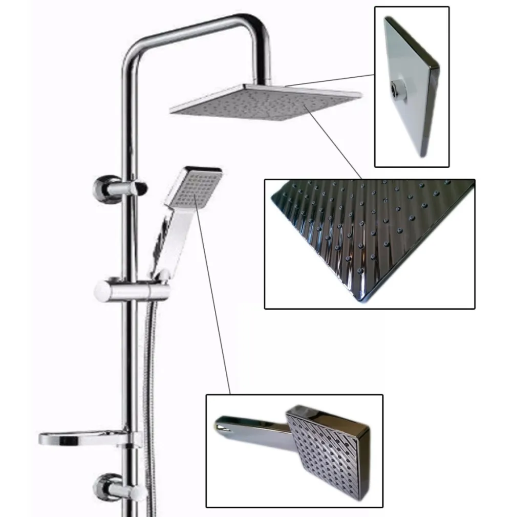 Set asta saliscendi doccia cromato, soffione fisso quadrato, braccio doccia con soffione di piccole dimensioni amovibile, il tutto con tubi flessibile e portasaponetta per poterlo subito montare nella vostra doccia o sostituire alla vecchia asta.