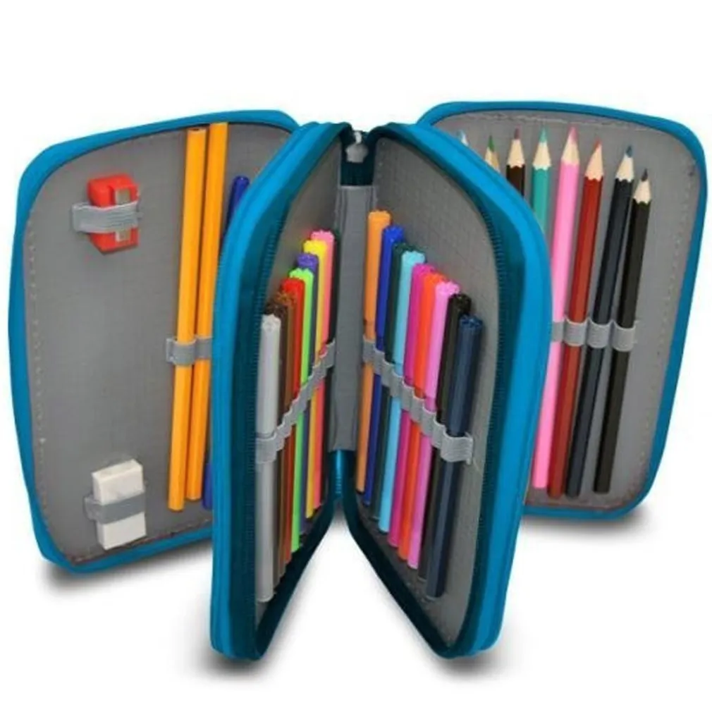 Astuccio triplo scomparto 3 zip serigrafato con i supereroi avengers: thor, iron man, capitann america e hulk. realizzato in resistente tessuto poliestere, contiene: 2 matite, 1 penna, 1 gomma, 1 temperamatite, 1 righello e 1 blok notes, 18 colori pennarelli e 18 colori pastello.