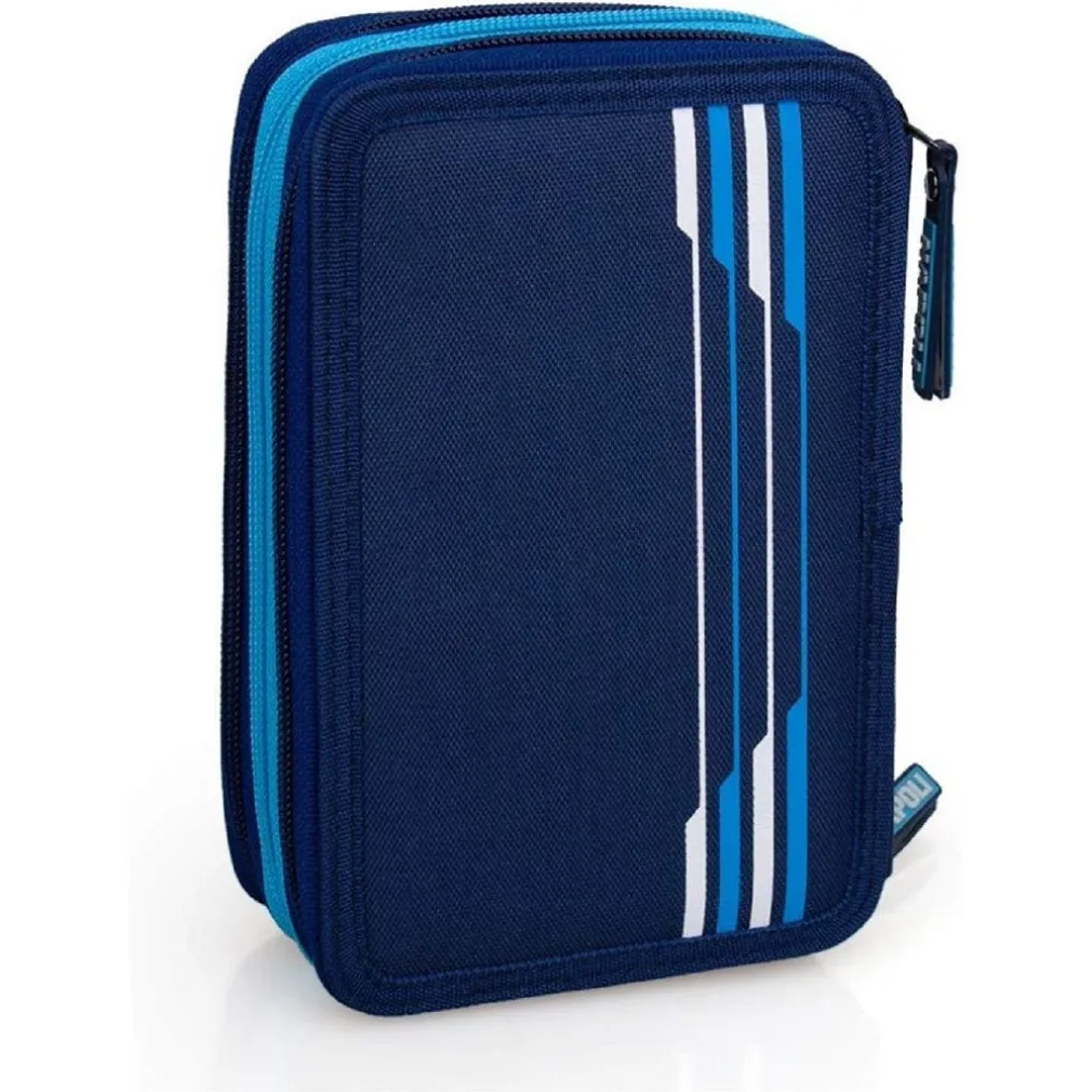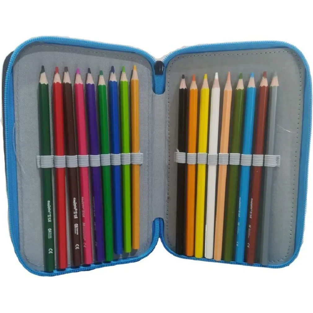 Pratico astuccio portapenne multi-scomparto della squadra partenopea più amata in Italia, il club che accolto il giocatore più famoso al mondo Diego Armando Maradona: il Napoli! L’astuccio si compone di 3 scomparti, rifinito ognuno con una chiusura a zip, il cui contenuto è così ripartito: nel primo reparto troverete 2 matite, 1 penna Rossa, 1 penna Blu, 1 gomma, 1 temperamatite, 1 righello e 1 paio di forbici; nel secondo 18 matite colorate Carioca; nel terzo infine 18 pennarelli colorati Giotto Turbo Color.