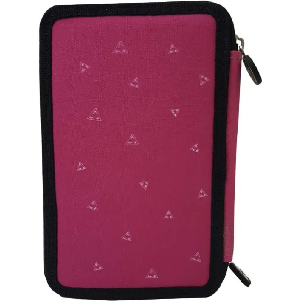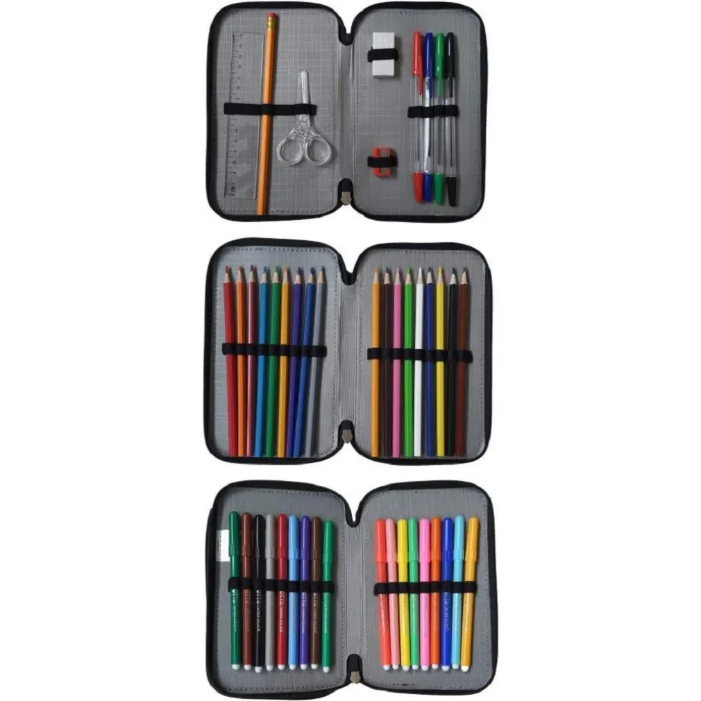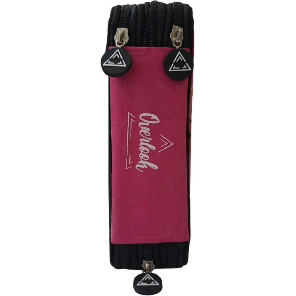 Originale astuccio portapenne multi-scomparto della serie Overlook. L’astuccio si compone di 3 scomparti, rifinito ognuno con una chiusura a zip, il cui contenuto è così ripartito: nel primo reparto troverete 1 matita, 1 penna Rossa, 1 penna Blu, 1 penna Verde, 1 penna Nera, 1 gomma, 1 temperamatite, 1 righello e 1 paio di forbici; nel secondo 18 matite colorate; nel terzo infine 18 pennarelli colorati Giotto Turbo Color. Sul davanti figura lo slogan “FIND YOUR OWN HAPPINESS”, mentre i tiretti delle chiusure a zip sono in gomma
