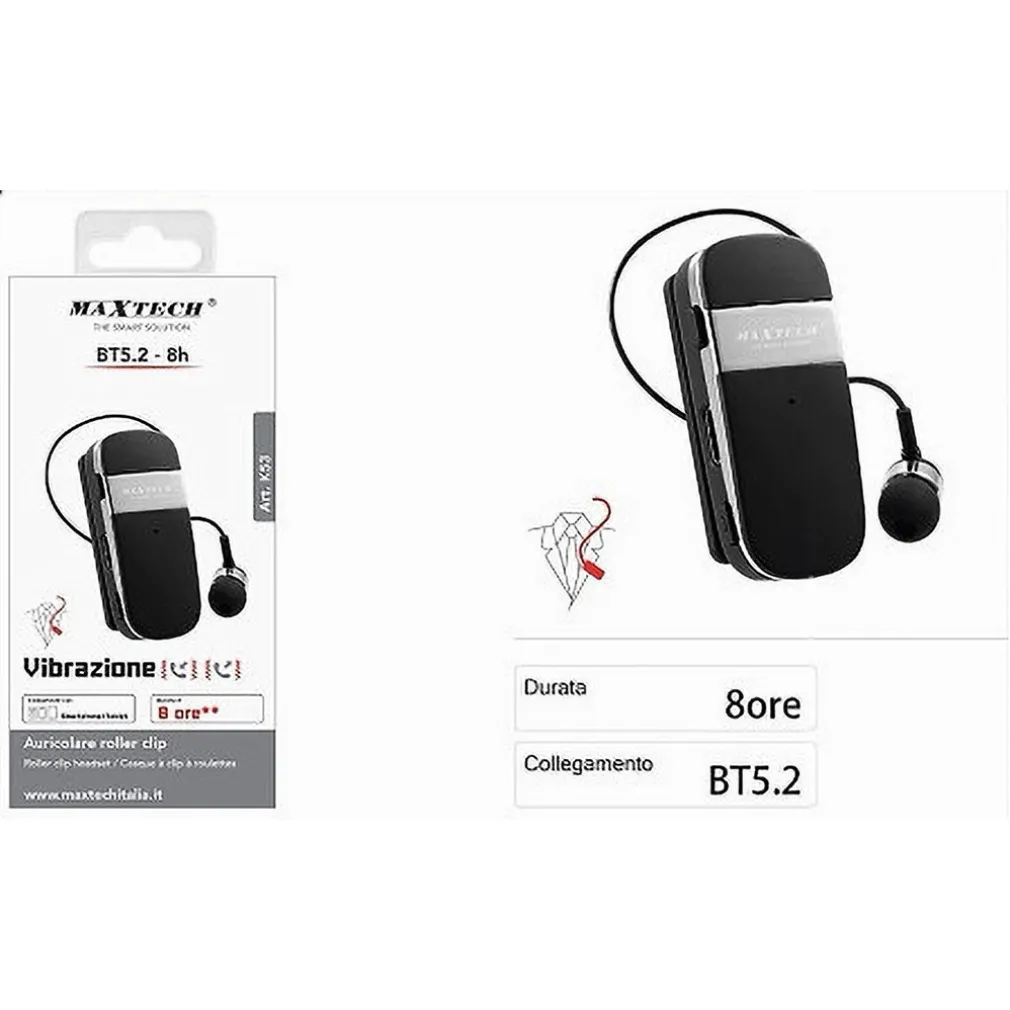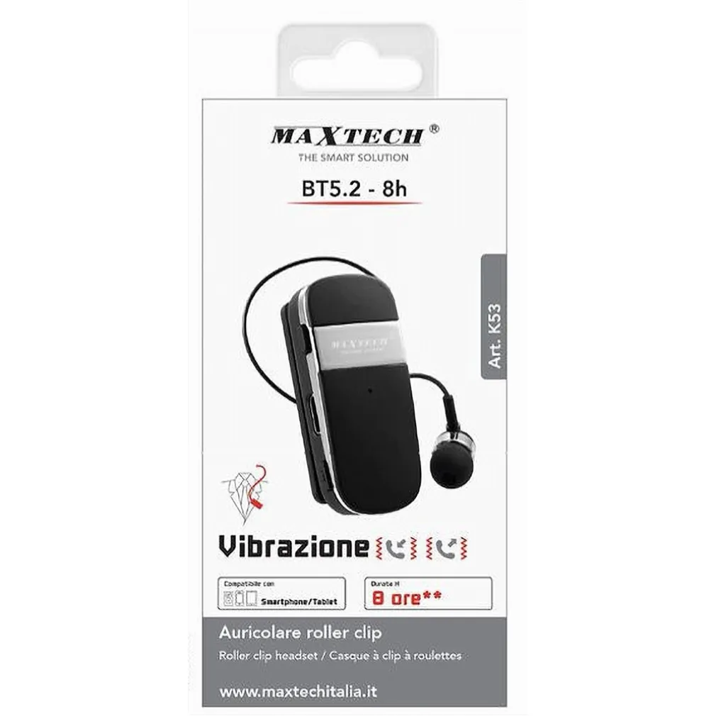 L’Auricolare Retrattile Roller Clip Bluetooth BT5.2 K53 si distingue per il suo design innovativo che unisce la praticità del meccanismo retrattile e la comodità della clip, permettendo di riporre l’auricolare in modo ordinato quando non in uso. La tecnologia BT5.2 garantisce connessioni stabili e di alta qualità, mentre la funzione vibrazione consente di non perdere mai una chiamata.
