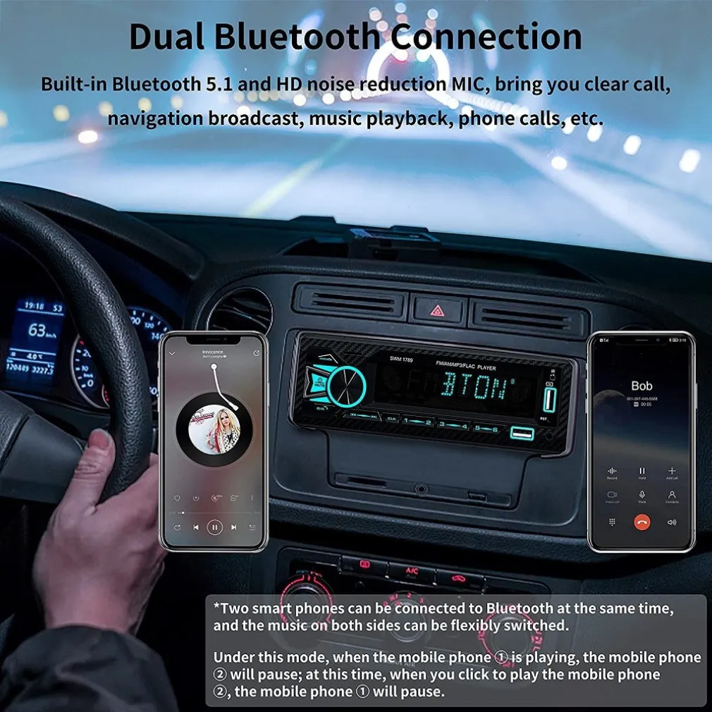 Autoradio Bluetooth 5.1 vivavoce, AUX, Lettore MP3 e doppia porta USB, suono stereo AM FM, Display LCD, Localizzare e trovare auto, iOS e Android. Dual Bluetooth 5.1 avanzato per autoradio, connessione rapida e semplice, fornisce chiamate in vivavoce più chiare, migliori e più stabili e riproduzione musicale. È possibile collegare due smartphone contemporaneamente e la musica su entrambi i lati può essere cambiata in modo flessibile, compatibile con dispositivi Android e iOS.