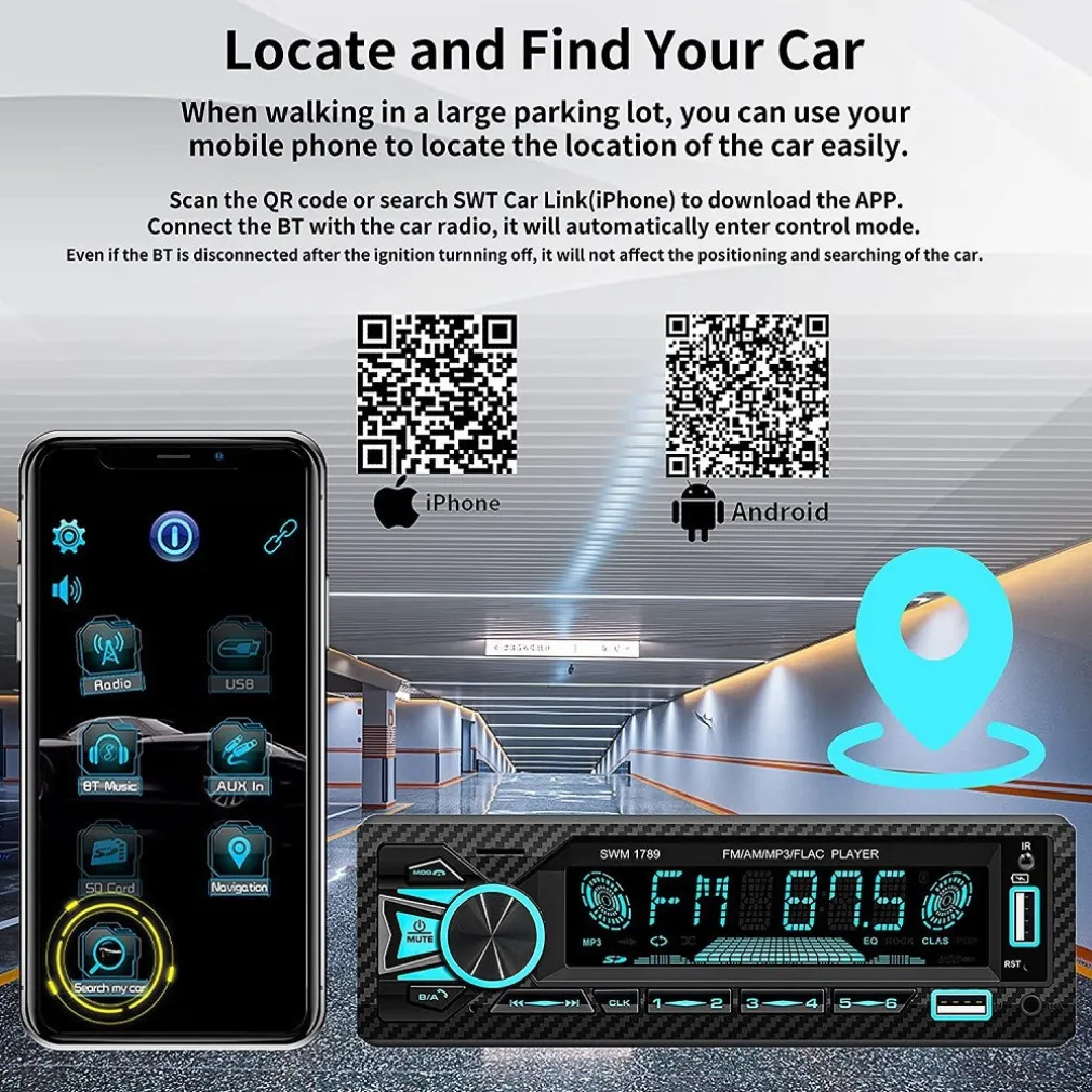 Scarica un’APP dedicata su Android o Apple App Store, l’autoradio può tramite il telefono cellulare riprodurre musica, effettuare chiamate, regolare la stazione radio, ecc. e passare a piacimento, fornendo un’esperienza operativa più fluida (scansionare il codice QR nel manuale per scaricare l’APP “SWT Car Link”. E’ necessario collegare il Bluetooth del cellulare prima di spegnere la fiamma. Dopo che la fiamma si è spenta, la disconnessione Bluetooth non avrà effetto.