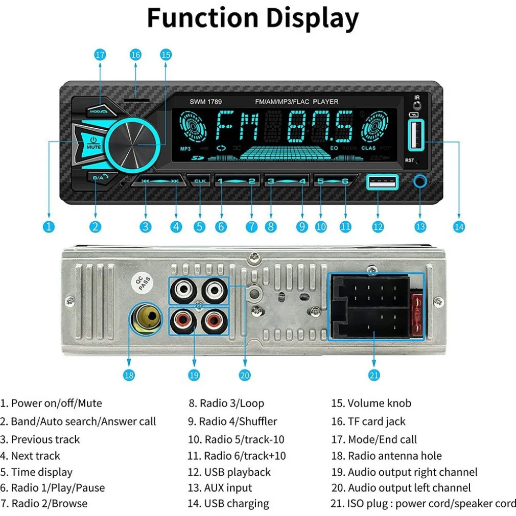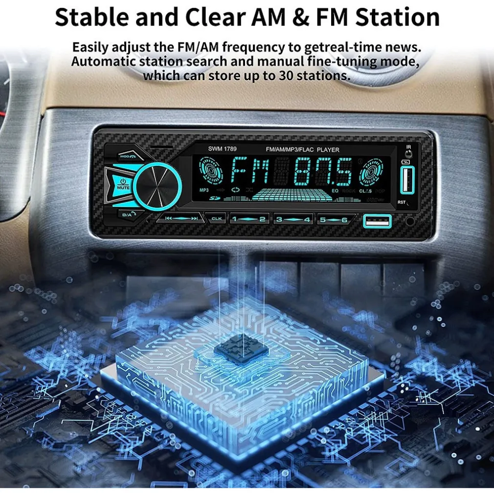 L’ultimo chip intelligente integrato, l’autoradio consente di ascoltare diverse stazioni radio e notizie come messaggi sul traffico, previsioni del tempo per evitare ingorghi. è possibile salvare trasmettitori, ora, data e altre impostazioni personali. Supporta la ricerca automatica delle stazioni radio, è possibile salvare fino a 30 stazioni. Nota: il cavo giallo va collegato al polo positivo della batteria, altrimenti l’autoradio non avrà memoria.