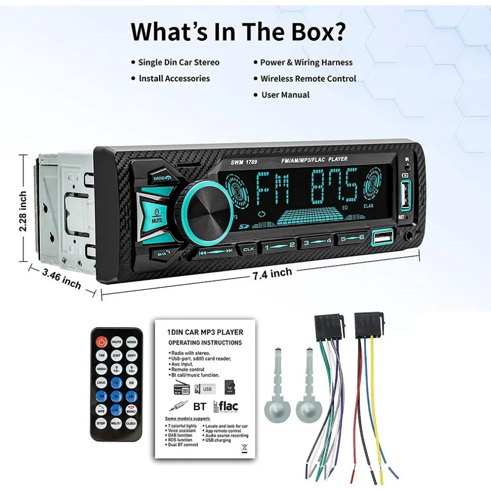 La nostra autoradio single din ha 2 porte USB per la ricarica rapida 2.1 e la riproduzione audio, che supporta la riproduzione di musica tramite BT, AUX, porta USB, TF (memoria massima fino a 32GB).Supporta la connessione diretta da autoradio e dispositivi esterni tramite ingresso AUX-IN per riprodurre musica.