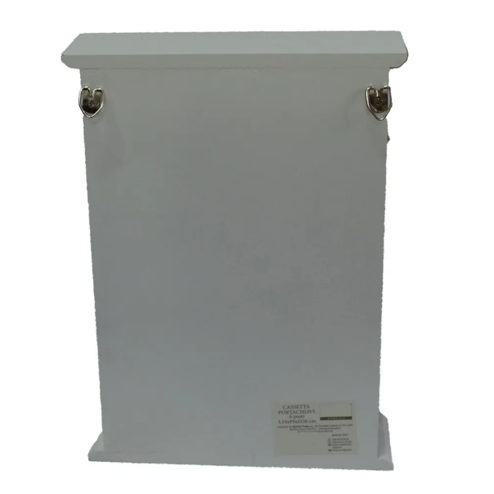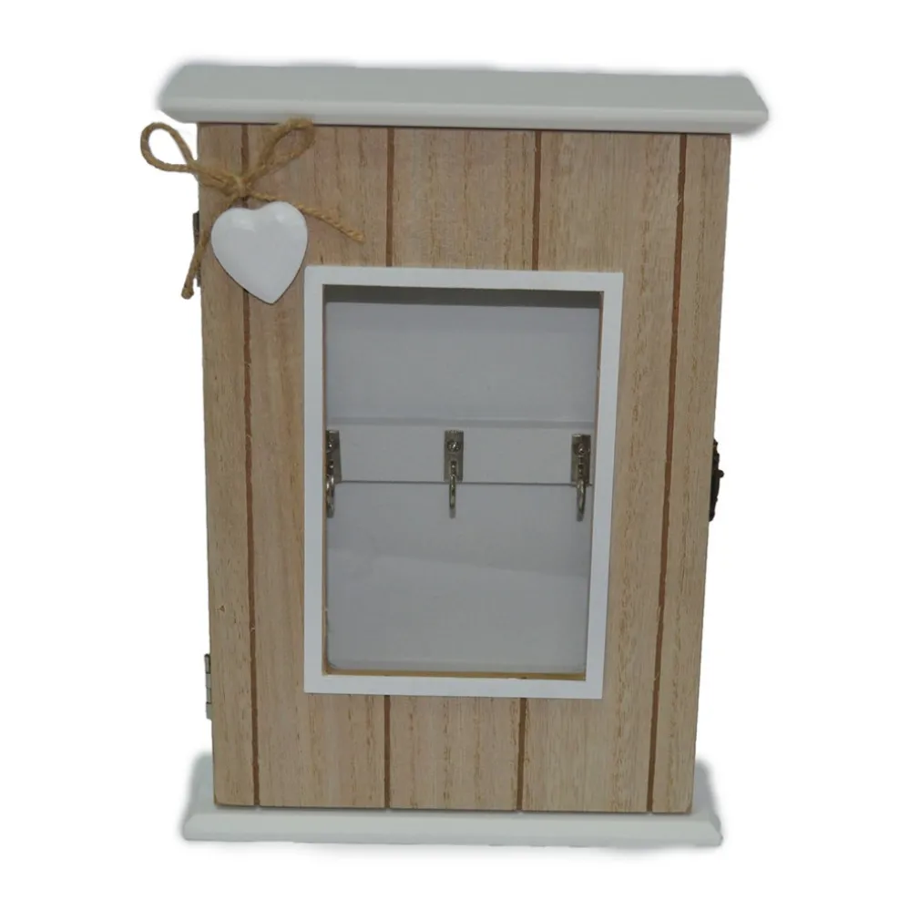Contiene sei ganci in metallo per chiavi, un cuore decorativo, sportellino con vetro centrale e ganci per montaggio a parete.