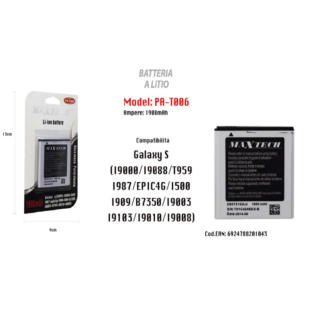 La nostra BATTERIA A LITIO 1900MAH è la soluzione perfetta per chi cerca una batteria di ricambio affidabile e di lunga durata per il proprio GALAXY S smartphone. Progettata specificamente per modelli come il I9000, I9088, T959, I987, EPIC4G, I500, I909, B7350, I9003, I9010, e I9008, questa batteria MaxTech PA-T006 garantisce performance ottimali e compatibilità senza compromessi.