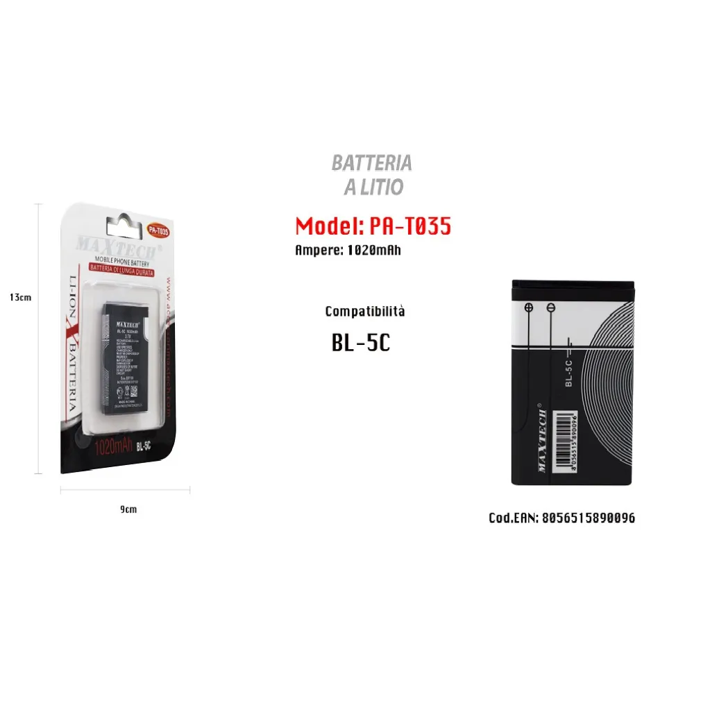 Questa batteria è progettata specificamente per garantire una perfetta compatibilità con i cellulari smartphone che richiedono la batteria BL-5C. Il modello PA-T035 di MAXTECH offre una potenza affidabile, consentendoti di godere appieno delle funzionalità del tuo dispositivo senza interruzioni.