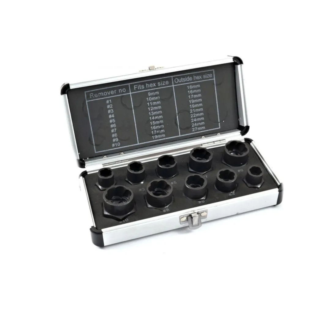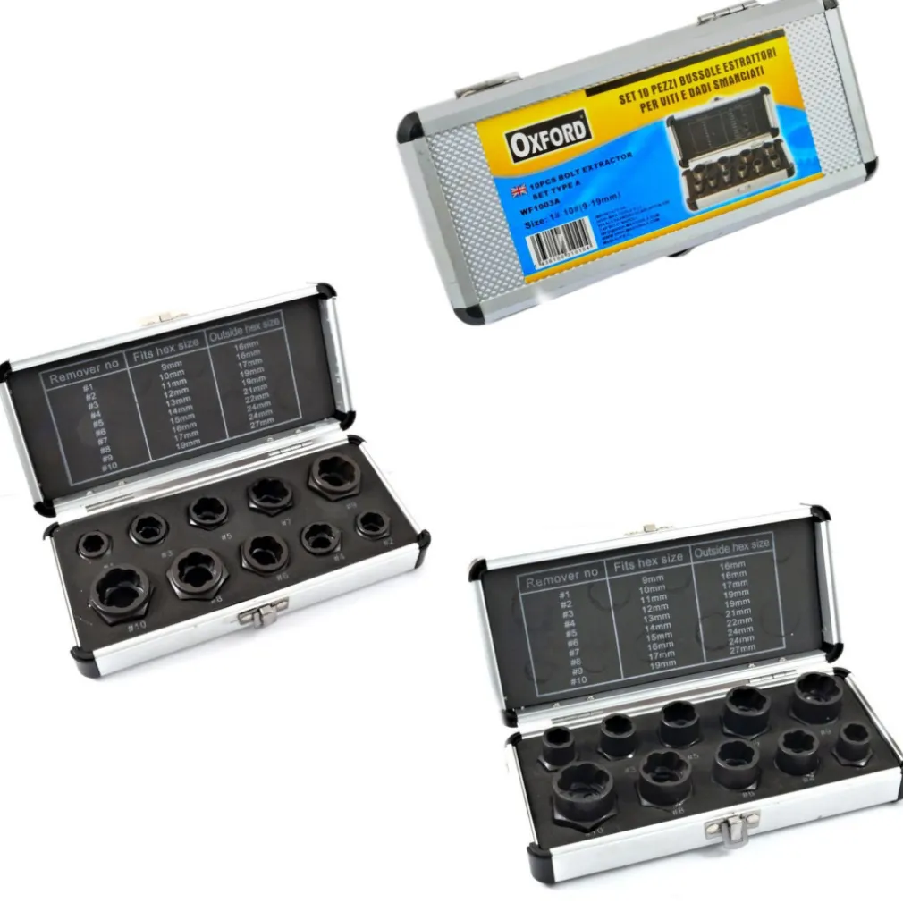 Set da 10 pezzi di bussole estrattori per bulloni e dadi smanciati e danneggiati. Con questo prodotto potrete facilmente svitare quei fastidiosissimi dadi o bulloni danneggiati, spanati, o smanciati che con una normale chiave non riuscireste a smontare. Pratiche per lavori professionali o per il fai da te, sono facilmente riponibili nella loro valigetta dopo essere state utilizzate.