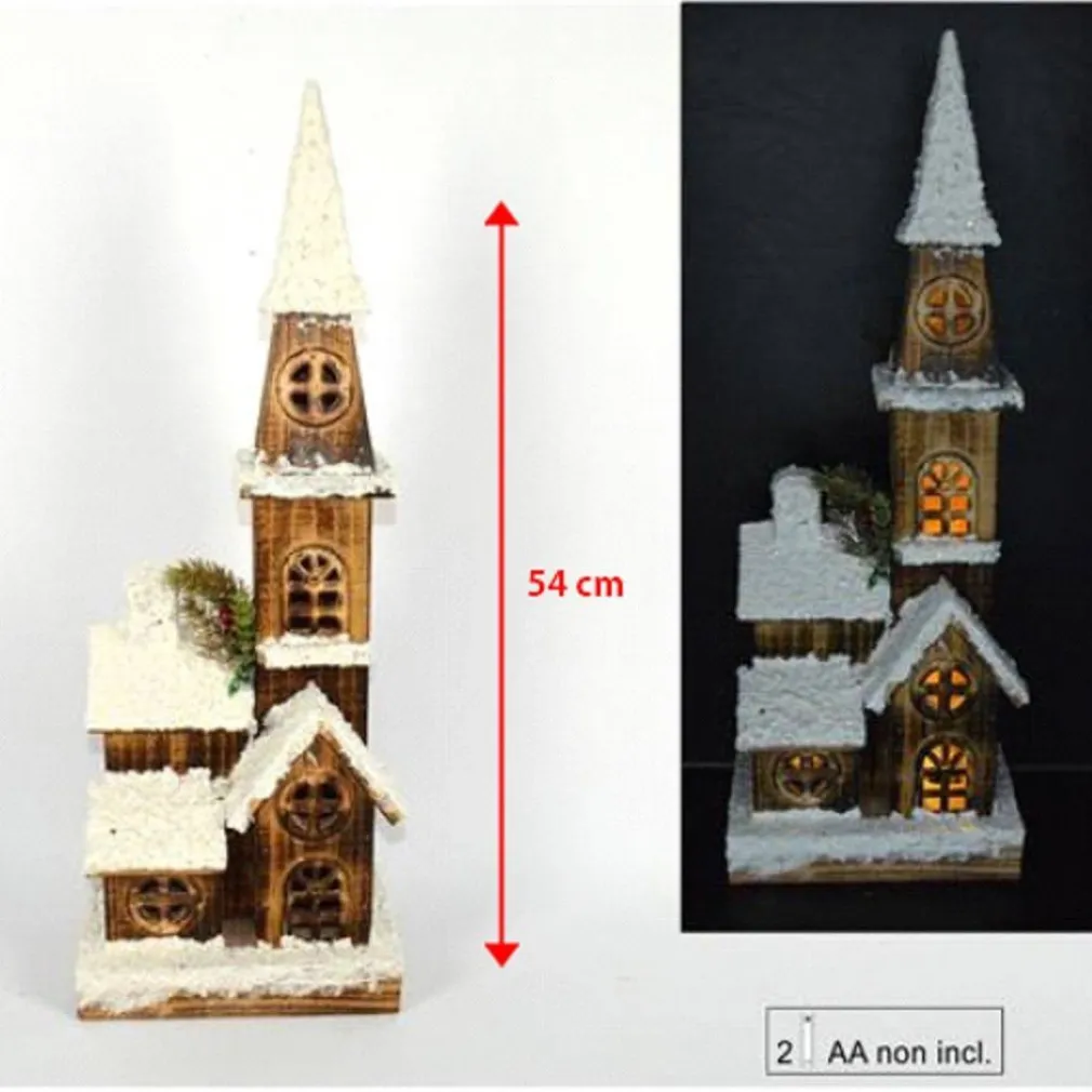 - 1 x CAMPANILE LEGNO INNEVATO CON LUCI GIALLE 54 CM
