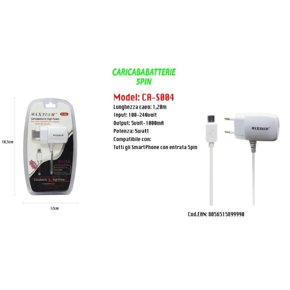 CARICABATTERIE DA RETE FISSA CON ATTACCO MICRO USB 5PIN 5V-1000MAH