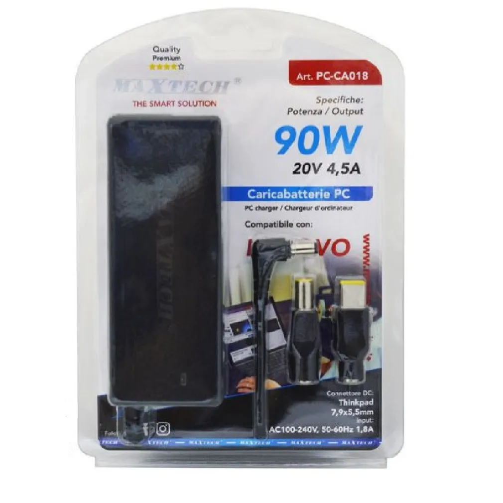 Il Caricabatteria per PC LENOVO modello PC-CA018 è progettato per fornire alimentazione affidabile e veloce al tuo dispositivo. Con un’input AC100-240V a 50-60Hz e 1.8A, e un’output di 20V a 4,5A, questo alimentatore ha una potenza di 90W. Il connettore DC è compatibile con il Thinkpad, misurando 7.9 x 5.5 mm.