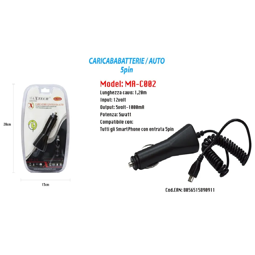 - CARICABATTERIA USB CARICATORE CAVO 1,20M DA AUTO RICARICA SMARTPHONE 5V-1000MA MA-C002