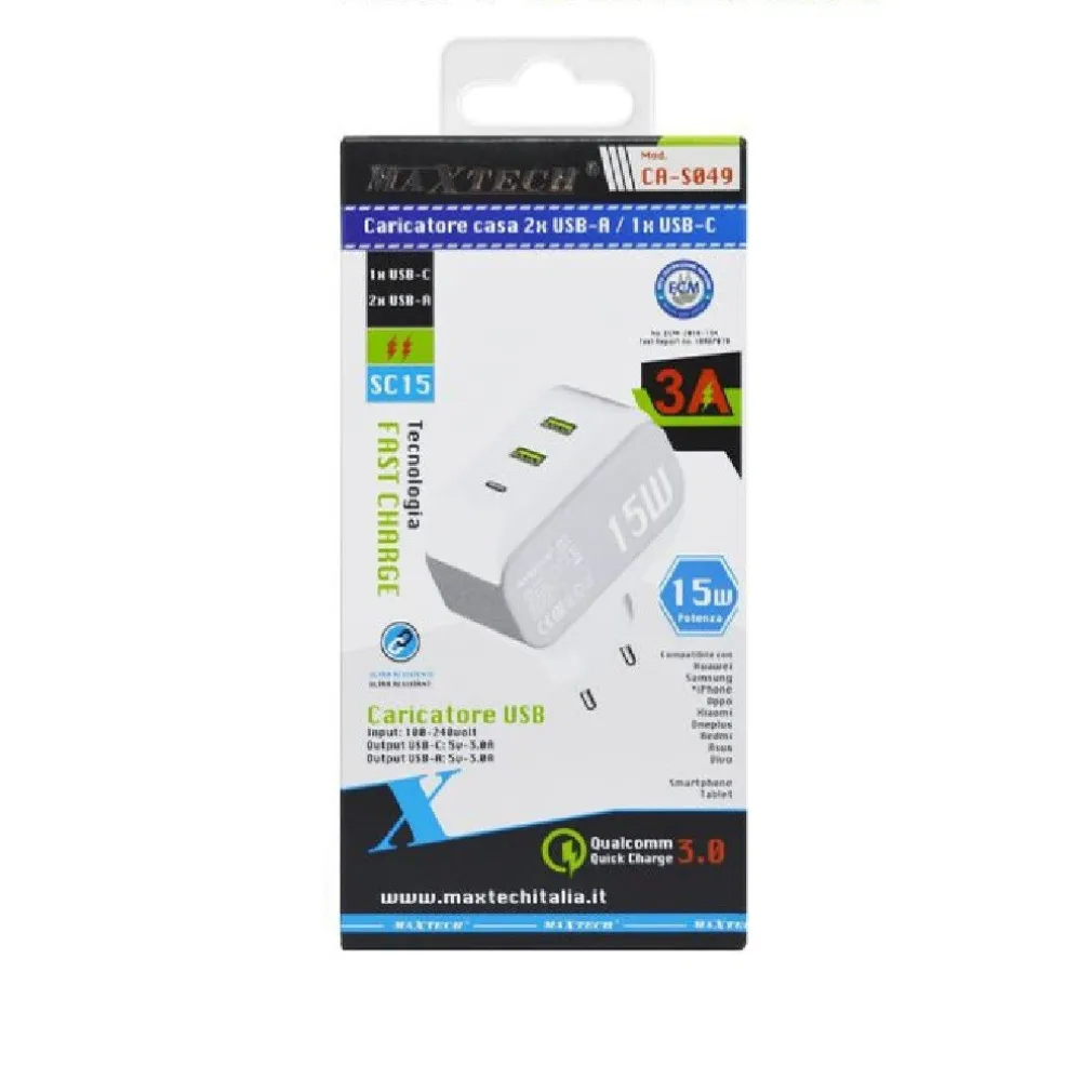 Caricatore da parete con 3 uscite 2x usb-a e 1x usb-c. 3 prese con una potenza massima di 15w per ricaricare più dispositivi allo stesso tempo. Il design è estremamente compatto per un facile trasporto. Con tripla porta consente di ricaricare più dispositivi contemporaneamente, ciò lo rende comodo da usare a casa, in ufficio o in viaggio.