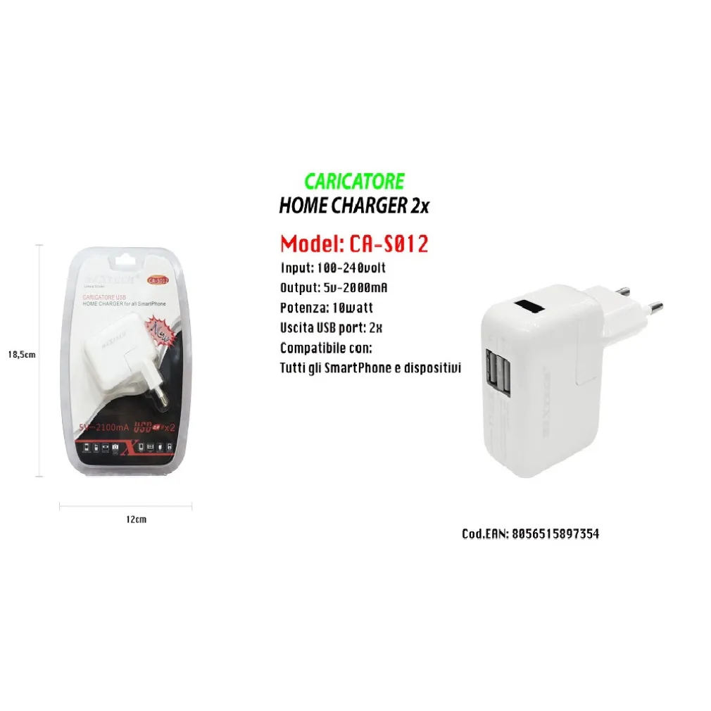 Dove posso utilizzare il Caricatore Presa Spina 2 USB Ultra Ricarica Smartphone CA-S012? Questo caricatore è adatto per l’uso domestico, in ufficio e durante i viaggi, grazie al suo design compatto e leggero che lo rende facilmente trasportabile ovunque tu vada.
