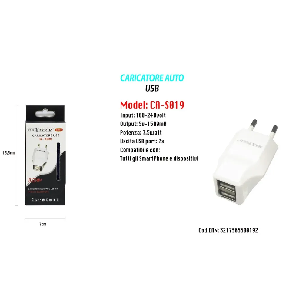 CARICATORE USB AUTO PORTATILE CELLULARE SMARTPHONE 5V – 1500MA 7.5W S019