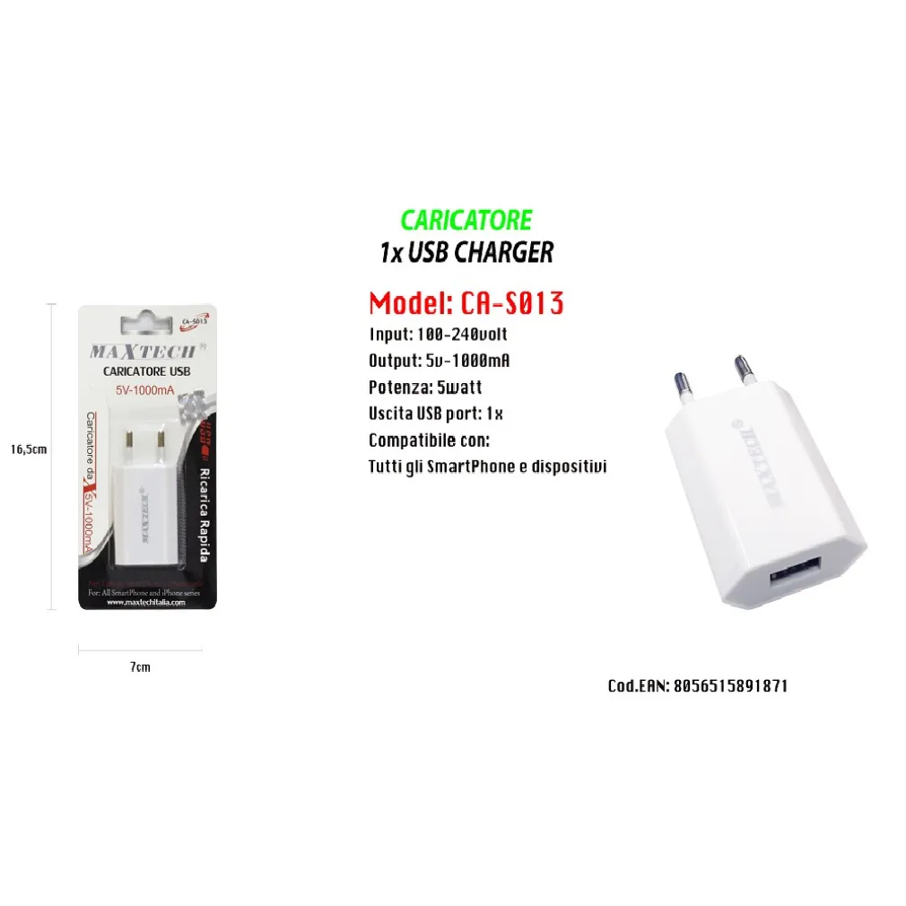 - Il Caricatore USB Ricarica per Smartphone iPhone Series 5V – 1000mA CA-S013 viene fornito con il caricabatterie da rete e il manuale di istruzioni.