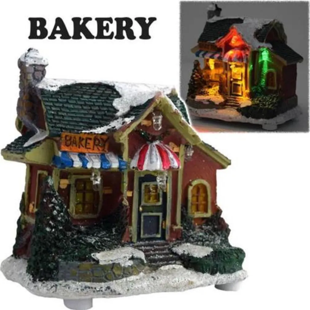 Scene natalizie assortite realizzate in poliresina con illuminazione a LED. Ideale per arredare la tua casa e prepararti ad un natale strepitoso. Le scene rappresentano varie strutture come la scuola, caffetteria, fornaio oppure una casa con pupazzo di neve.