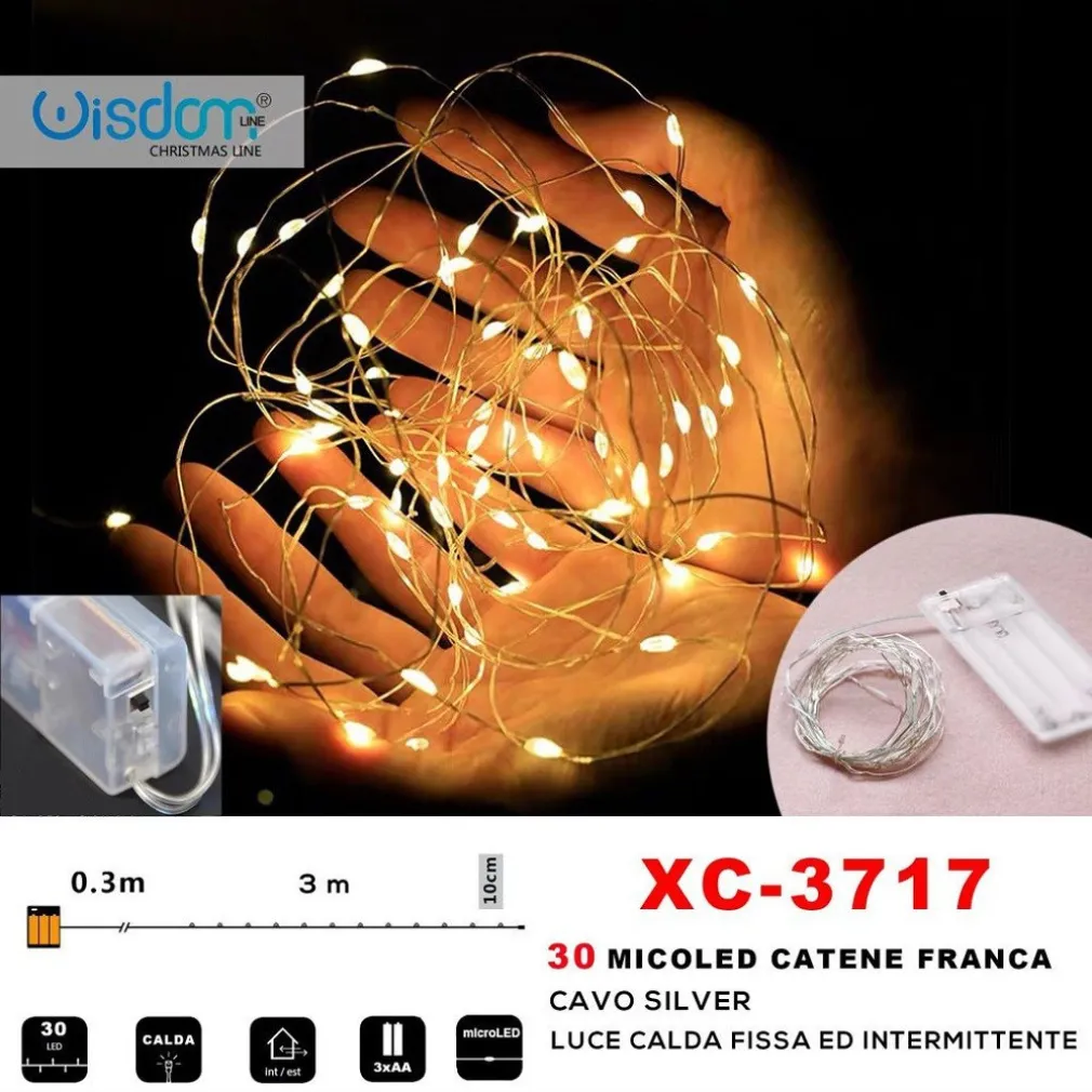 Catena di microled a batteria con cavo silver metallo flessibile. La decorazione dell’albero di Natale è sempre un magico momento che si ricorda poi nel tempo, da trascorrere in famiglia o in compagnia e riempie di gioia non solo gli occhi dei più grandi ma soprattutto dei più piccoli, incantali con un tocco di luce semplicemente fantastico con queste nuove serie di luci a batteria di alta qualità. Va alimentata con 3 batterie. Risulta ideale per allestimenti e decorazioni in ambienti interni ma anche per la creazione di originali segnaposto natalizi o per wedding.
