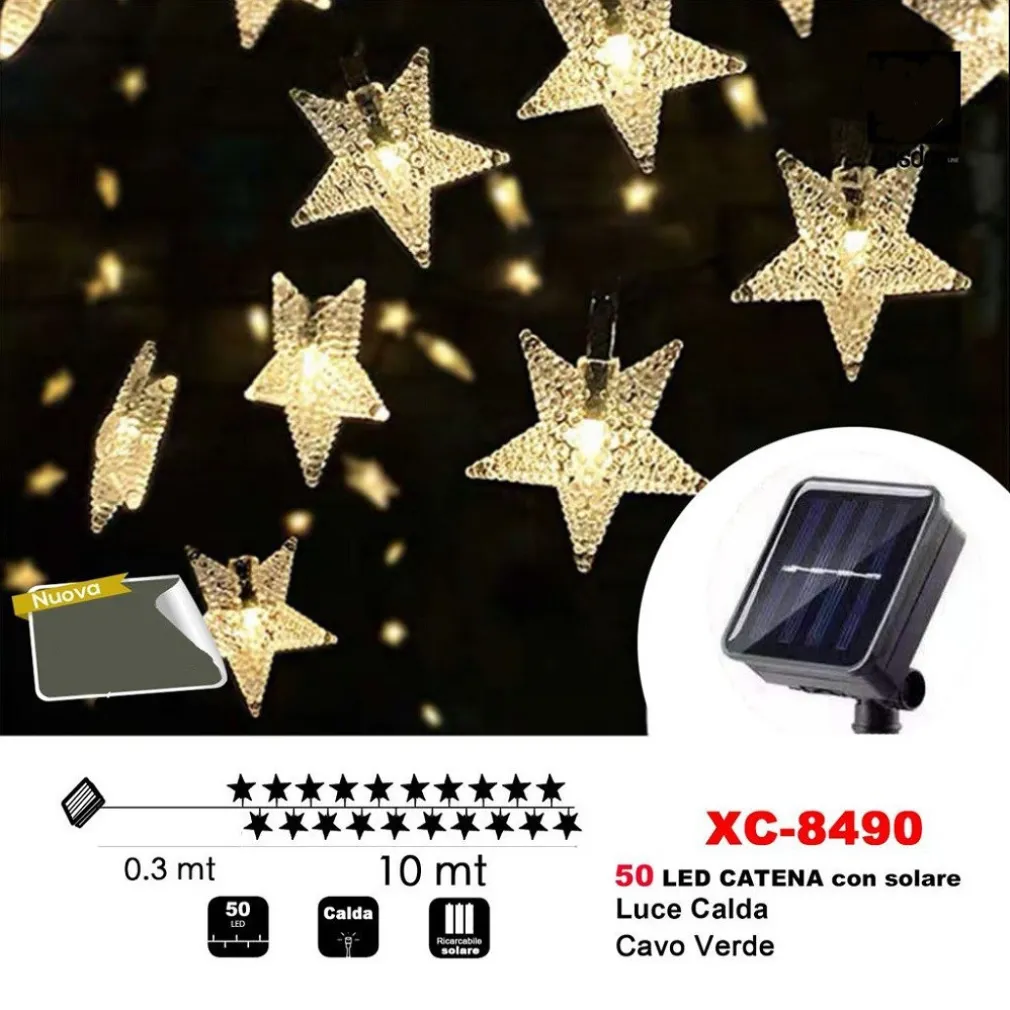 Catena Luci a LED luminosi a forma di stelle Natalizia con alimentazione con ricarica solare