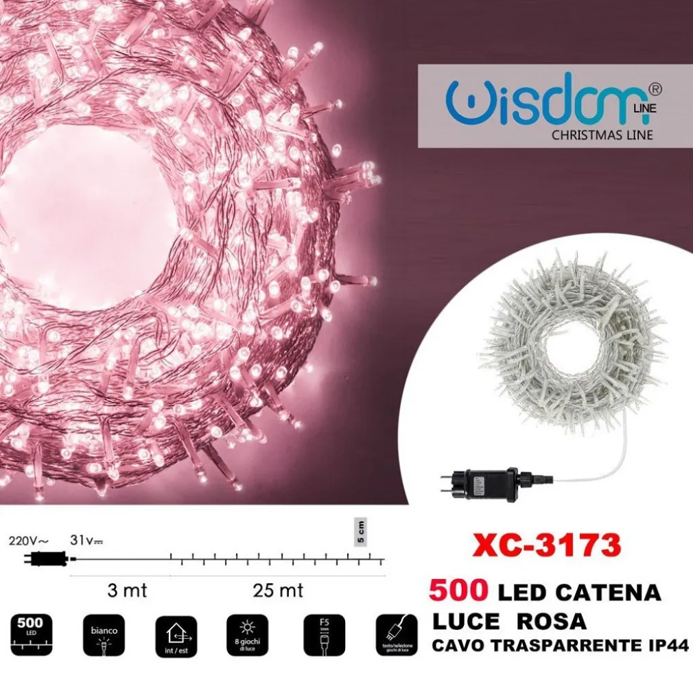 CATENA LUMINOSA 500 LUCI LED LUCCIOLE LUCE ROSA CAVO TRASPARENTE IP44 XC-3173
