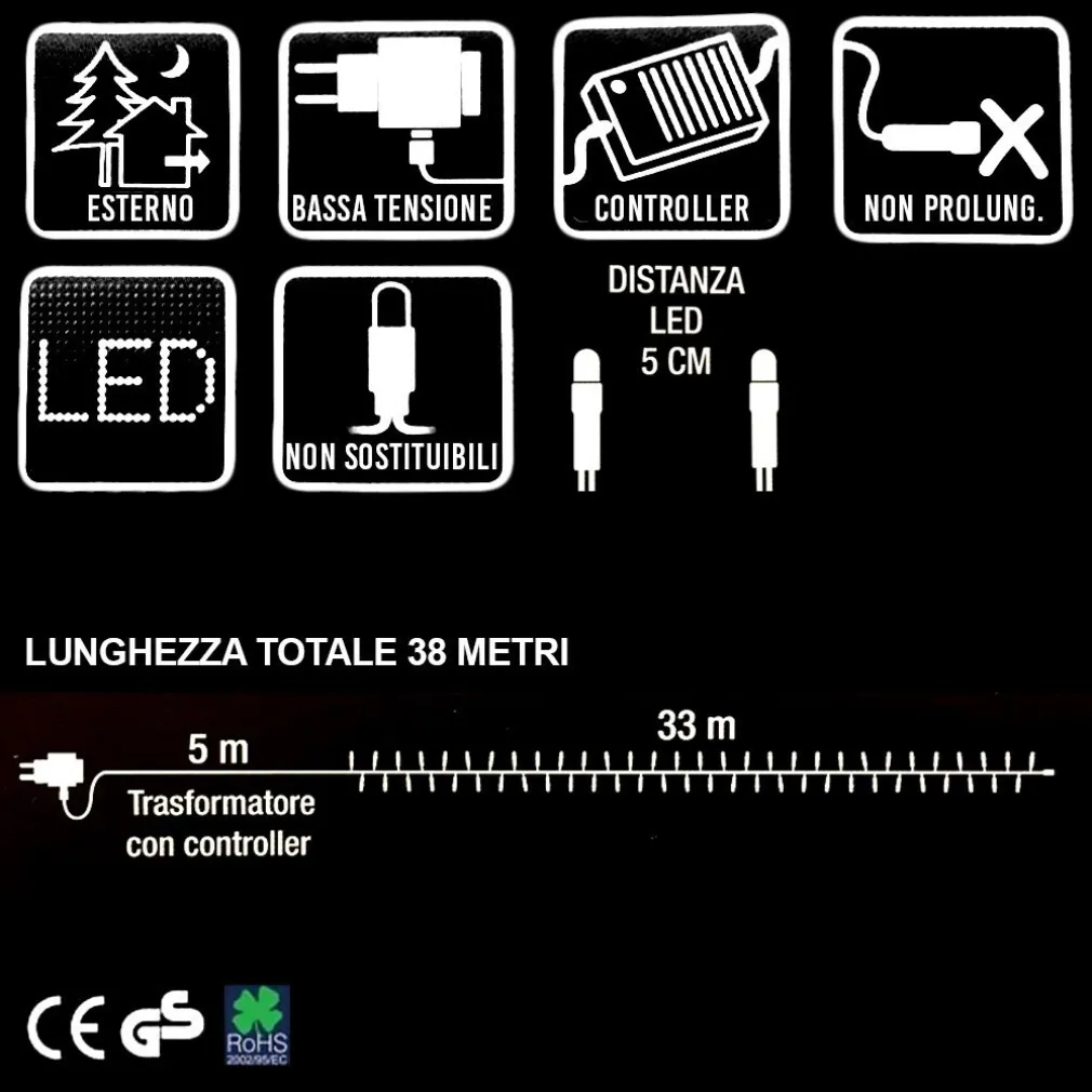 - Lunghezza Totale della Catena Luminosa: 38 Metri ( 33 mt luci + 5 mt Cavo Alimentazione )
