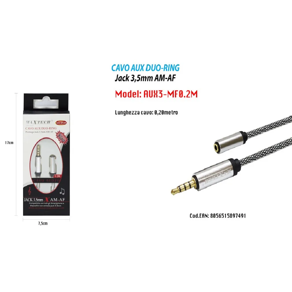 CAVO AUDIO JACK 3,5MM AM/AF 0.20MT PROLUNGA PER SMARTPHONE MAXTECH AUX3-MF0.2M
