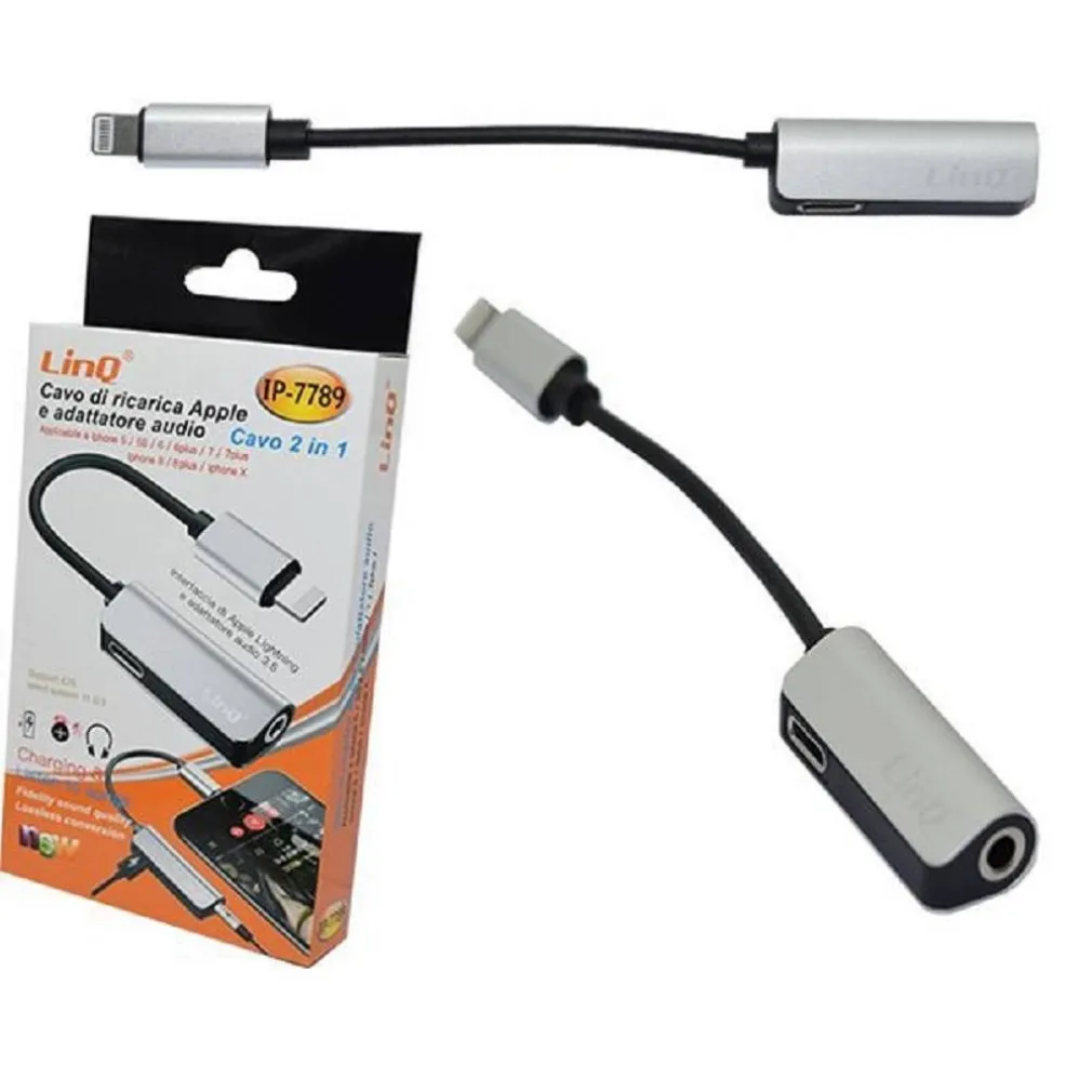 - Per un corretto funzionamento, collegare innanzitutto il cavo di ricarica e le cuffie lightning all’adattatore. Collegare l’adattatore secondario all’iphone