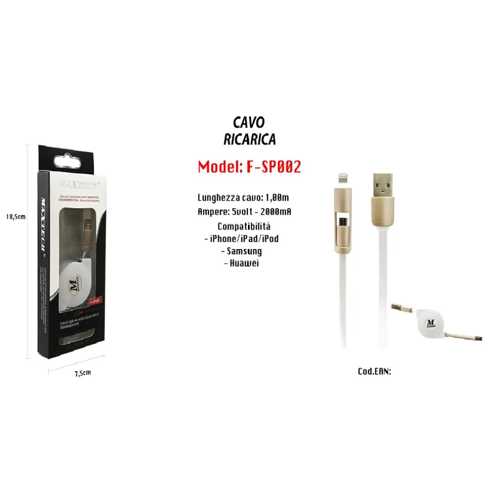 La confezione include il cavo di ricarica F-SP002 di Maxtech. Acquista oggi stesso questo cavo per garantire una ricarica affidabile e veloce per i tuoi dispositivi iPhone, Samsung e Huawei.