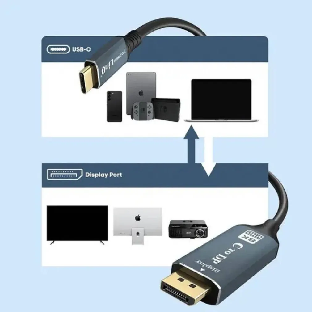 Cavo adattatore video da USB-C maschio a DisplayPort maschio. Consente di collegare smartphone, tablet e computer USB-C a un display DisplayPort. Perfetto per giochi, presentazioni, home cinema, videoconferenze, ecc. Supporta la risoluzione 8K / 60 Hz per una visualizzazione ad alta definizione. I connettori placcati in oro a 24 carati e il cablaggio in rame garantiscono una trasmissione affidabile del segnale. Misura 1 metro e 80, si collega agevolmente a casa, in ufficio, in sala riunioni, ecc. Non richiede alcuna configurazione, installazione Plug and Play. Design compatto e leggero, per la massima portabilità.