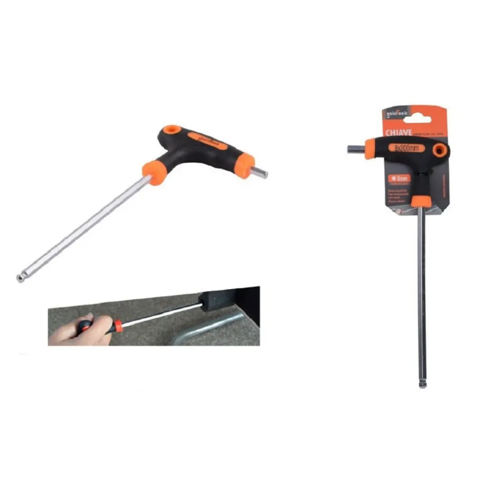Chiave con impugnatura di manovra. Realizzate in acciaio cromo vanadio queste brugole sono perfette anche per i professionisti che necessitano di una qualità elevata. L’accurato proporzionamento dell’impugnatura ergonomica, in funzione della dimensione della chiave, garantisce serraggi elevati anche in spazi ristretti. Chiavi a T con punta sferica e impugnatura ergonomica. L’estremità sferica consente di operare con un’inclinazione fino a 30° rispetto all’asse della vite.