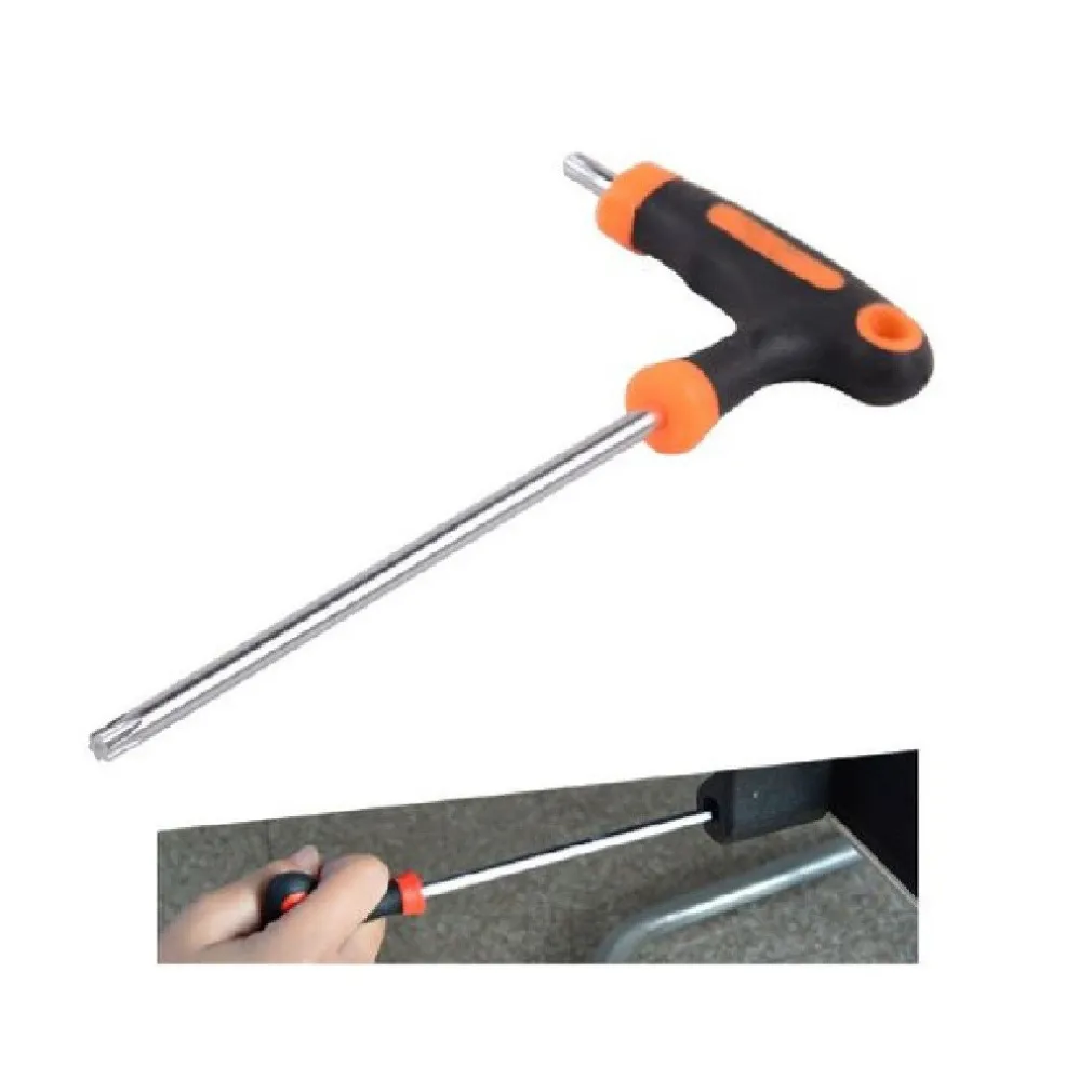 Chiave con impugnatura di manovra. Realizzate in acciaio cromo vanadio queste brugole sono perfette anche per i professionisti che necessitano di una qualità elevata. L’accurato proporzionamento dell’impugnatura ergonomica, in funzione della dimensione della chiave, garantisce serraggi elevati anche in spazi ristretti. Chiavi a T con punta a stella e impugnatura ergonomica.
