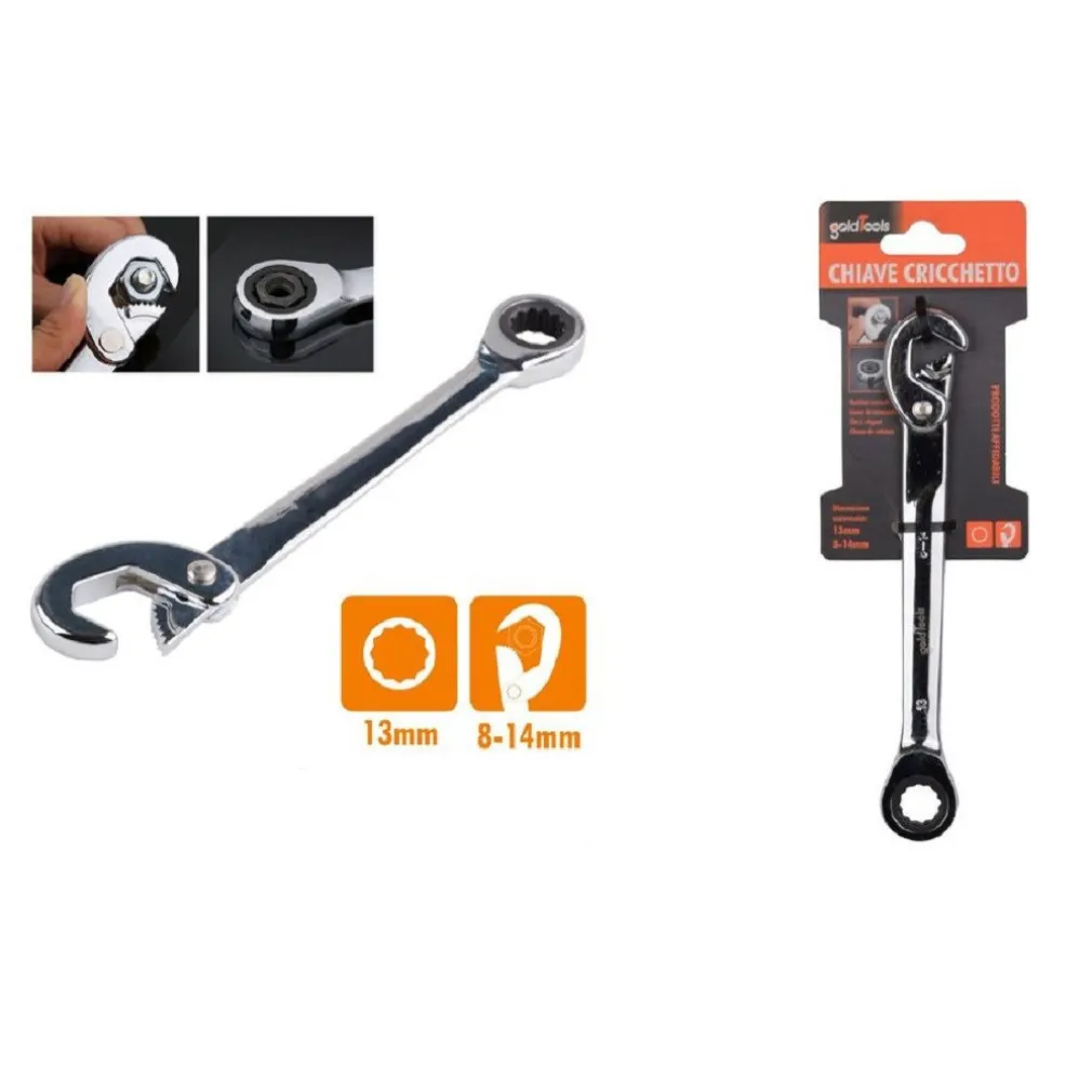 Chiave con doppia funzione universale e a cricchetto. La chiave universale multifunzione è ideale per risolvere problemi con valvole, rubinetti, tubi. Adatta per dadi e bulloni da 8 a 14 mm. Il meccanismo a cricchetto, invece, permette di stringere o allentare senza la necessità di rimuovere la chiave dal bullone ed ha una dimensione di 13 mm.
