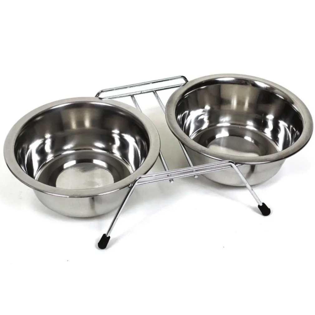 Solitamente tutti i cani hanno almeno due ciotole a disposizione, una per l’acqua ed una per la pappa. Ma se non volete che queste vengano sparse in giro per casa, potete acquistare una comodissima doppia ciotola con supporto, in acciaio poste su una struttura metallica rialzata dotata di piedini in gomma antiscivolo. Le ciotole sono asportabili e lavabili in lavastoviglie. Il supporto è costituito da una base bassa realizzata in acciaio, i cui piedini rivestiti in gomma assicurano una maggiore stabilità ed evitano scivolamenti durante i pasti del vostro fedele amico. Su tale supporto sono predisposti degli appositi anelli dove inserire le due ciotole in acciaio (incluse). Una postazione comoda ed igienica dove il vostro animale consumerà tranquillamente i suoi pasti.