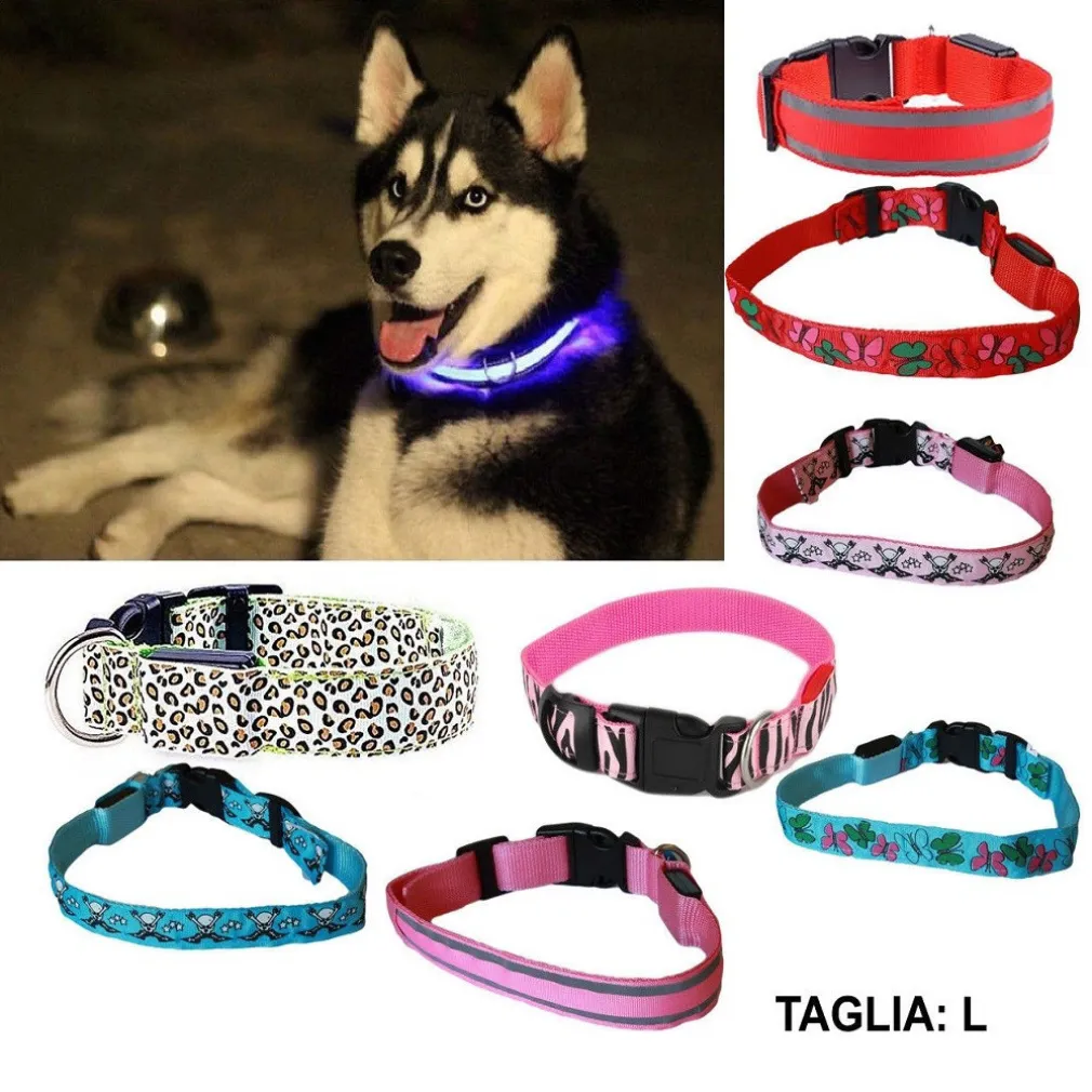 COLLARE LED LUMINOSO PER CANE CANI SICUREZZA NOTTURNA CLIP FANTASIA TG.L