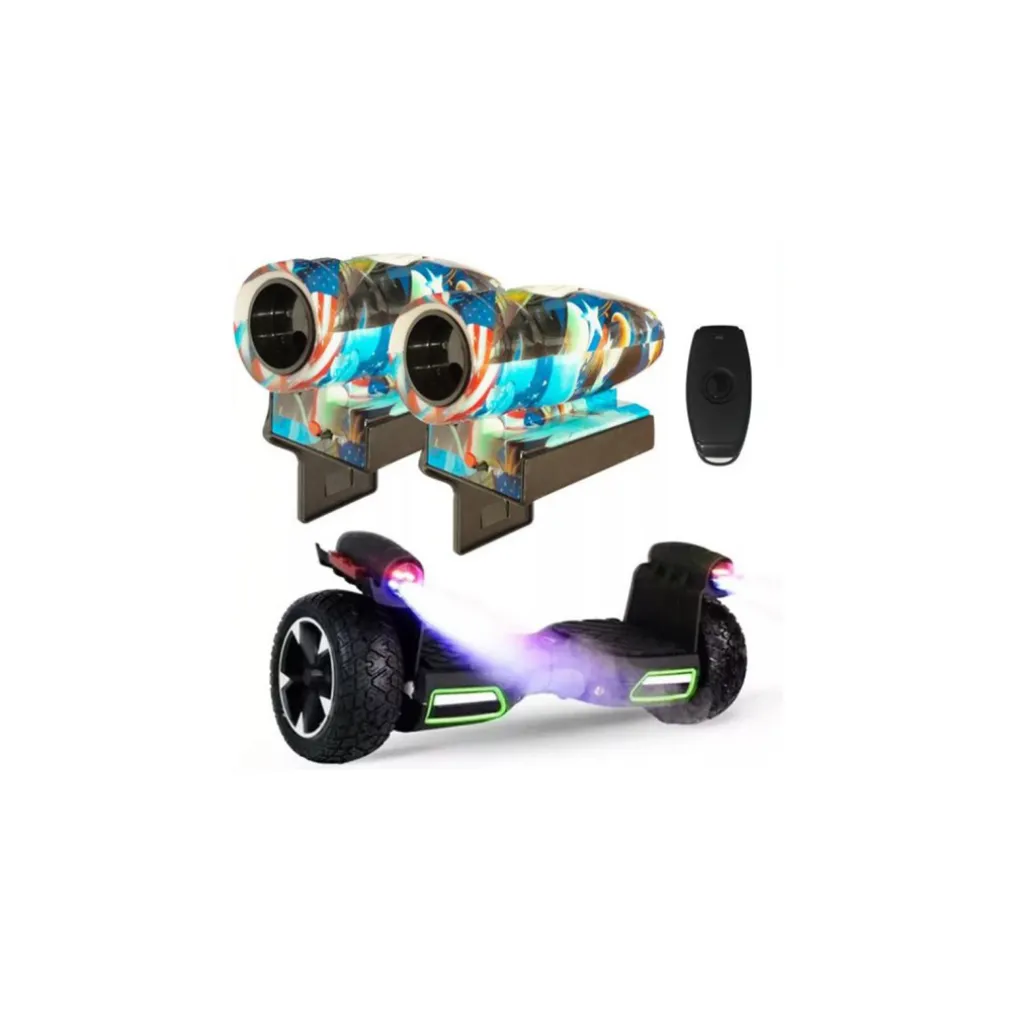 Simpatica coppia di marmitte finte, per donare un tocco unico e distintivo al tuo hoverboard, skateboard o pattino. basta applicarle lateralmente grazie alle staffe di montaggio incluse e il gioco sará fatto! emetterá ben 5 suoni diversi, imitando quelle delle grandi moto, e ben 2 colori di luci. con la nostra coppia di marmitte potrai sentirti un vero pilota !