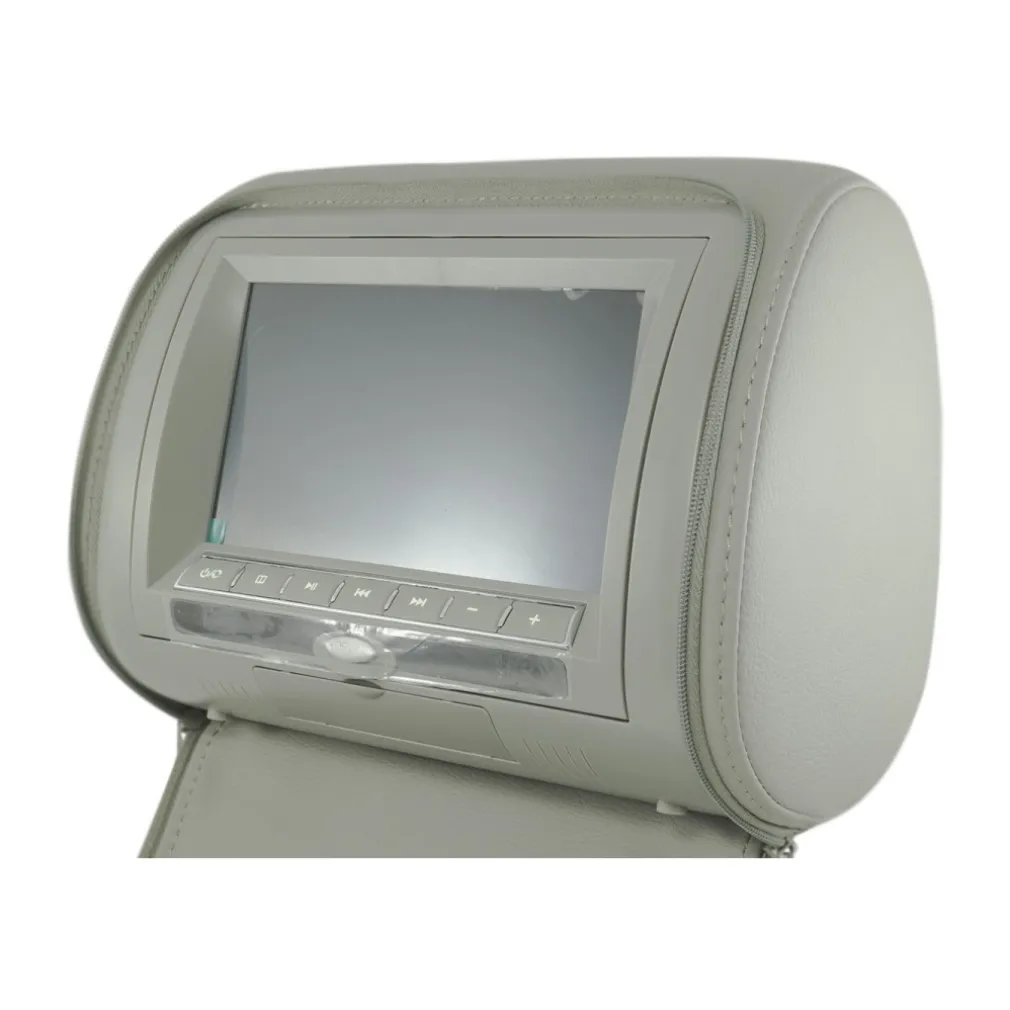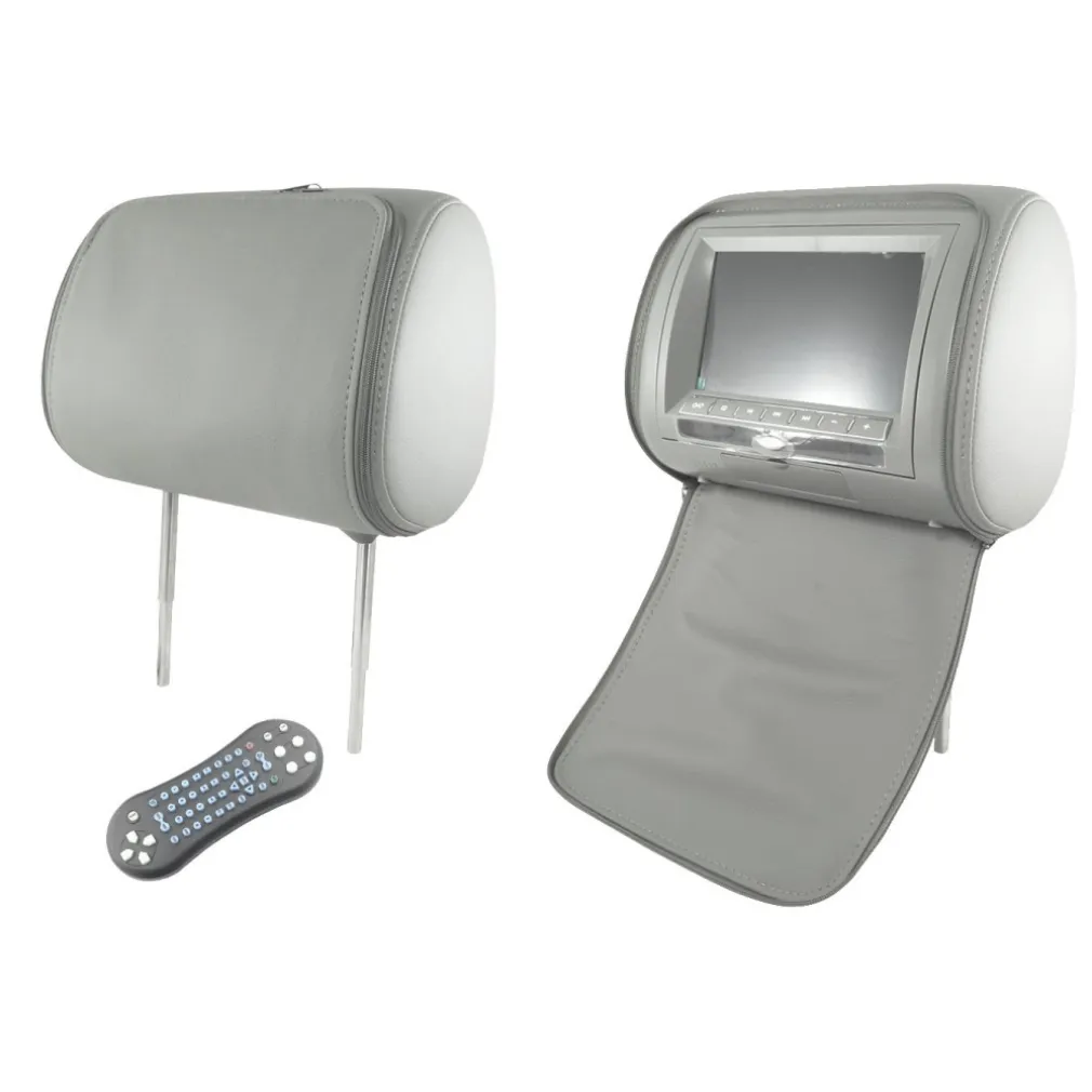 Coppia di poggiatesta per auto con monitor da 7 pollici. Di colore grigio che si adatta bene a qualsiasi autovettura. Non c’è bisogno di modificare il poggiatesta di serie intaccando così l’integrità della tappezzeria; il montaggio è molto più semplice di quanto si pensa: basta togliere gli originali, inserire i nuovi poggiatesta con monitor attraverso le 2 cannette regolabili, e i cavi di collegamento passeranno attraverso lo schienale del sedile: non bisogna smontare il sedile della propria autovettura. Uno dei due poggiatesta è munito di lettore DVD integrato, ingresso AUX, lettore scheda SD e porta USB. Questi monitor oltre ad avere una presa cuffia sul frame sono dotati di telecomando IR