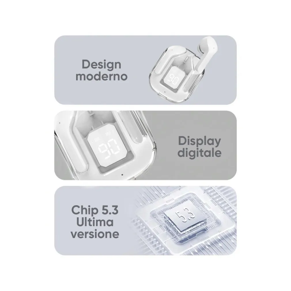 Vivi un’esperienza audio senza precedenti con le Cuffie Ultrapods Max. Questi auricolari di ultima generazione sono progettati per offrirti qualità sonora eccezionale e massima praticità, grazie alla tecnologia Bluetooth 5.3 che garantisce una connessione stabile e veloce. Perfetti per ascoltare musica, rispondere a chiamate o interagire con il tuo assistente vocale, gli Ultrapods Max uniscono stile, funzionalità e comfort in un design innovativo e trasparente con Display LED.