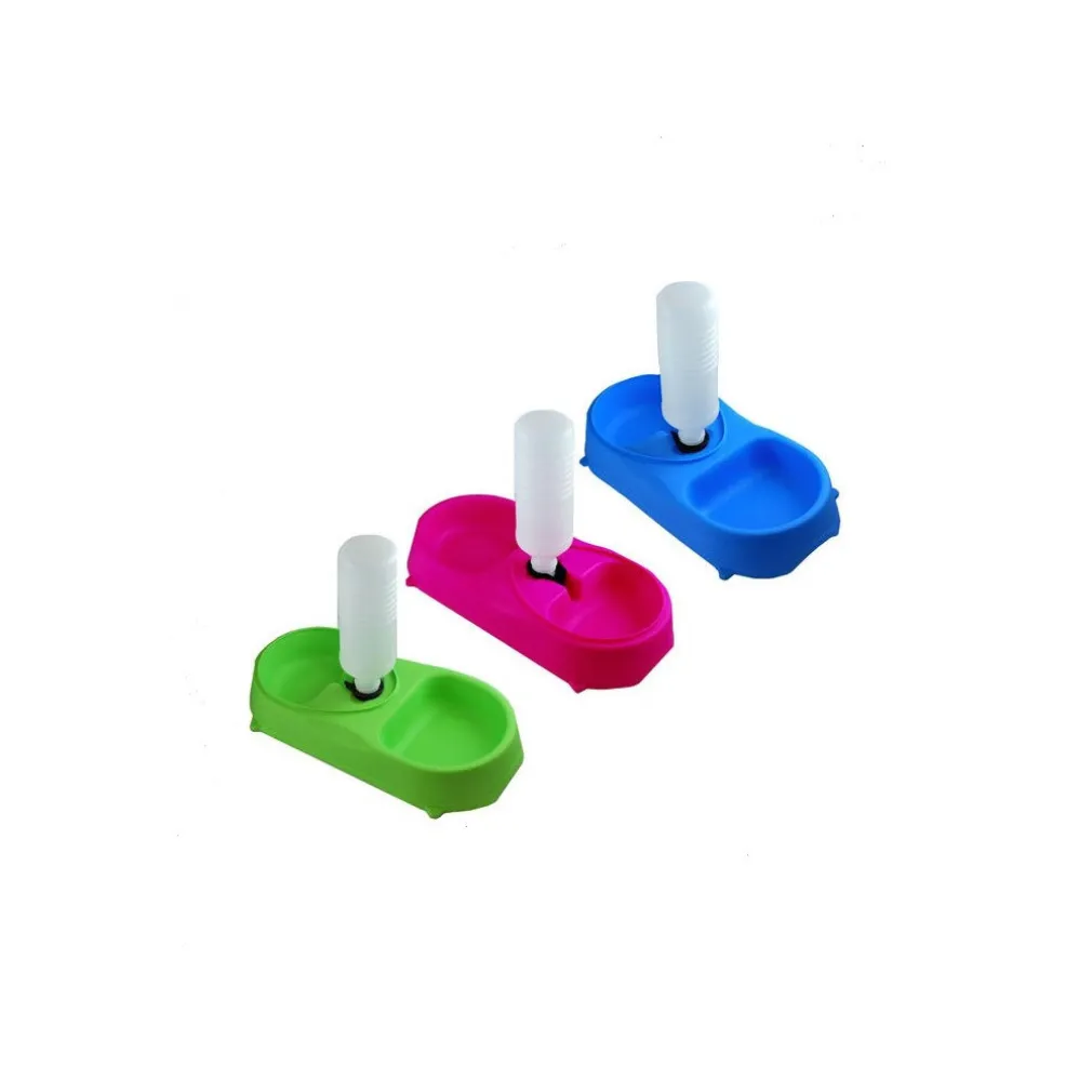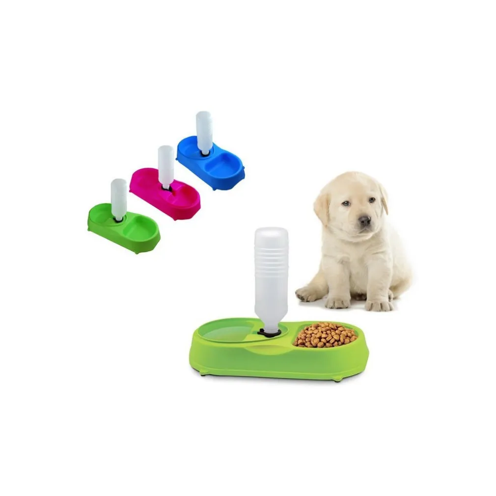 Doppia ciotola con sistema di rifornimento automatico d’acqua grazie al quale il vostro amico a 4 zampe non rimarrà mai più a bocca asciutta!! Sistema di dosaggio integrato, basta riempire la bottiglia (non inclusa) e avvitarla nell’apposito beccuccio, questo permetterà lo scorrere della quantità giusta d’acqua nella ciotola, mantenendo sempre una riserva necessaria. Inoltre, offre la possibilità al vostro animale di fornirsi anche del cibo oltre che acqua.
