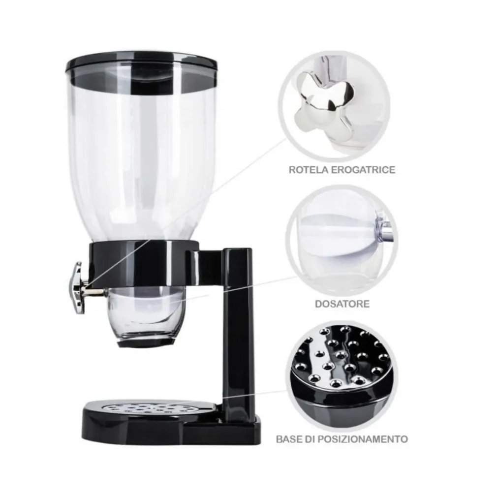 Realizzato interamente in plastica di alta qualità questo bellissimo disepenser è l’ideale per conservare cereali, muesli, caramelle, mix di frutti, chicchi di caffè o pasta senza alterare la loro flagranza.