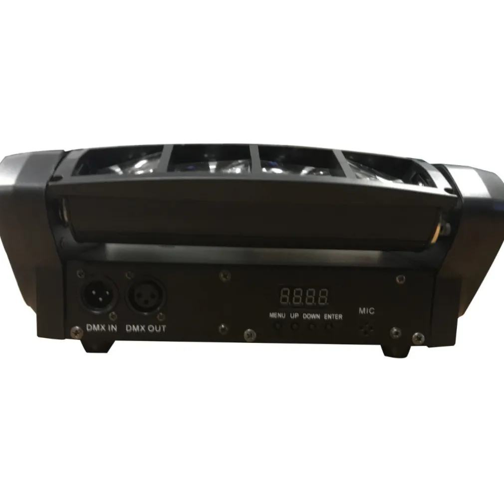Mini Spider multibeam, tecnologia led con 8 led da 3w molto luminoso, genera 8 raggi di luce ben definiti tipo laser, effetto Chase otto zone con due barre LED che si possono inclinare in modo indipendente, singolo controllo pixel, controllo del suono, master / slave, stand-alone e modalità DMX, funzione dimmer e strobo, display a LED con 4 tasti, corpo nero robusto. Particolarmente indicato per dj set e serate danzanti in genere discoteca mobile e spettacoli in genere, effetto davvero molto bello e particolare.