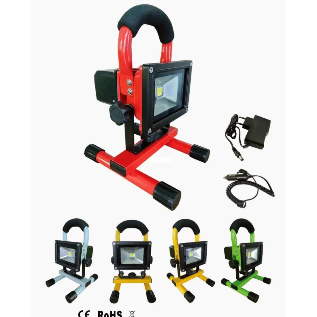Faretto a led portatile con batteria integrata. Ideale per lavori di fai da te o per illuminare zone in cui non è presente la corrente elettrica. La potenza luminosa è assicurata da una sorgente a LED che assicura bassi consumi e luminosità elevata. Il faro può essere facilmente trasportato grazie alla pratica impugnatura o può essere poggiato grazie alla staffa da pavimento in dotazione. Il prodotto è enche per uso esterno in quanto è impermeabile agli spruzzi d’acqua. La carica del faretto avviene tramite caricatore a tensione di rete o tramite il pratico caricatore da auto(entrambe i caricatori sono inclusi in confezione).