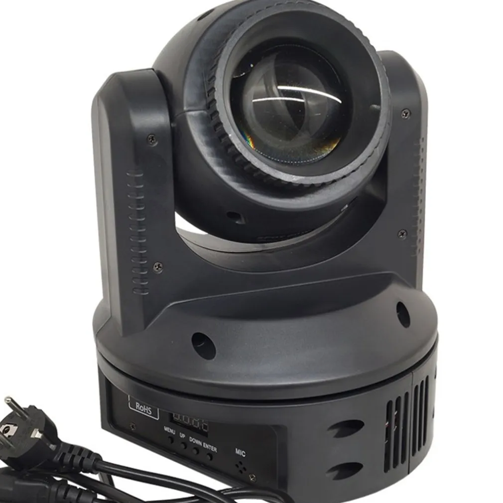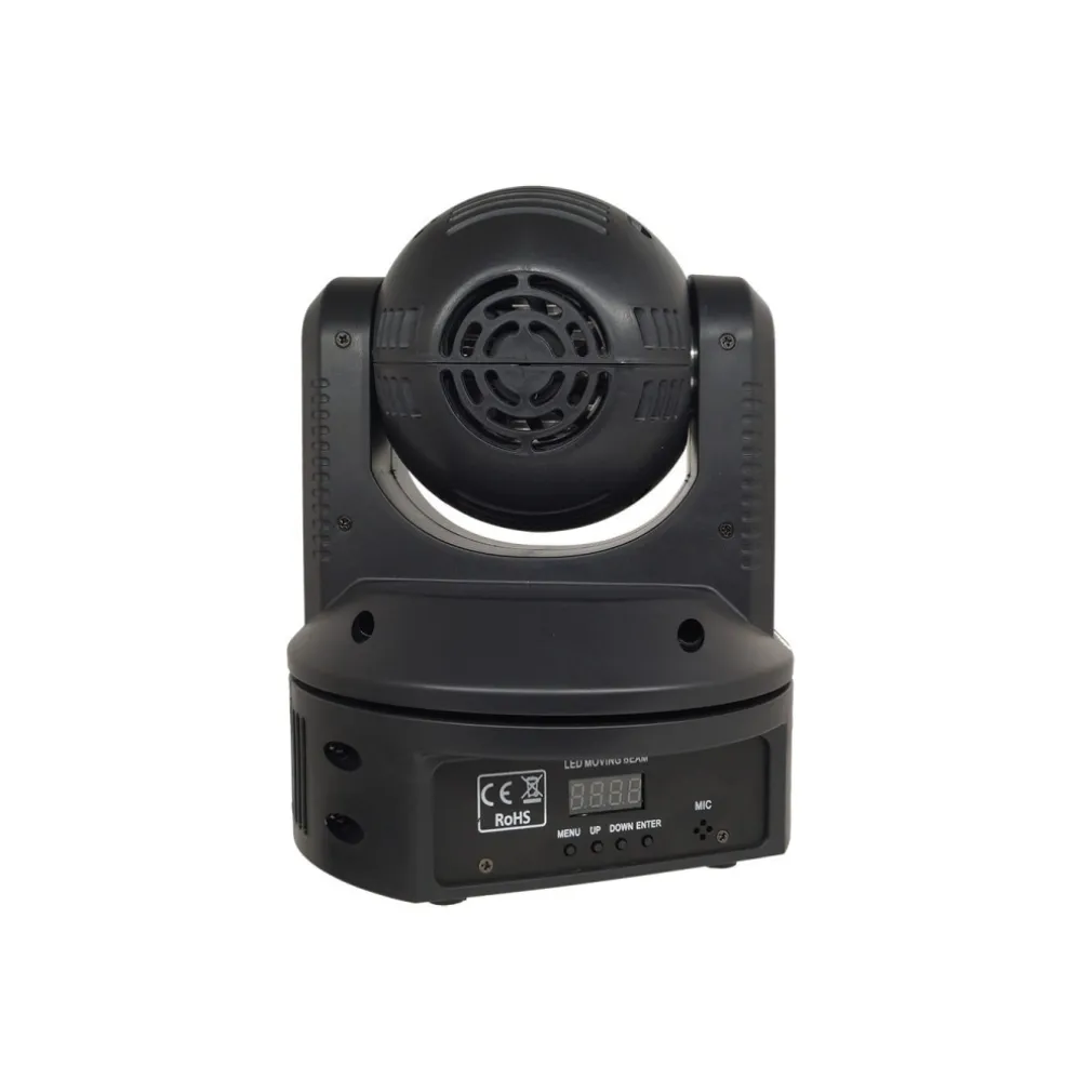 Faro con testa rotante a LED effetto disco colorato e strobo. Può essere montato a parete grazie alle staffe in dotazione, ma anche lasciato a terra o su di un ripiano grazie ai piedini in gomma antiscivolo. Può essere comandato a distanza tramite cavo DMX. Dal design compatto, offre tutte le funzioni che deve possedere una testa mobile di oggi. Adatto a qualsiasi ambiente: casa, discoteca, pub, locali per feste e in qualsiasi caso si necessiti il suo utilizzo. Nella parte frontale è presente il display ed i comandi per la programmazione. Nella parte posteriore sono presenti gli attacchi DMX e l’attacco all’alimentazione.