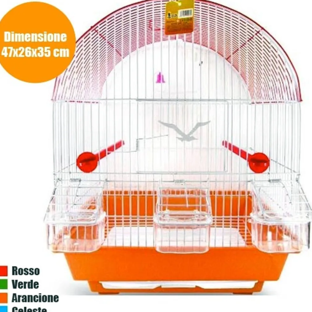 Gabbia per uccelli forma Arco. Realizzata in metallo con fondo in plastica e manico in metallo. E’ adatta a canarini, pappagallini, esotici e altri uccelli. Completa di accessori: 2 posatoi, e 2 mangiatoie. Il gancio in cima alla gabbia consente di spostarla e appenderla facilmente. Dotata di porticina frontale per un facile accesso e, inoltre, è dotata di fondo in griglia per permetterne la pulizia. Disponibile in diversi colori (inviati in base alla disponibilità in magazzino).